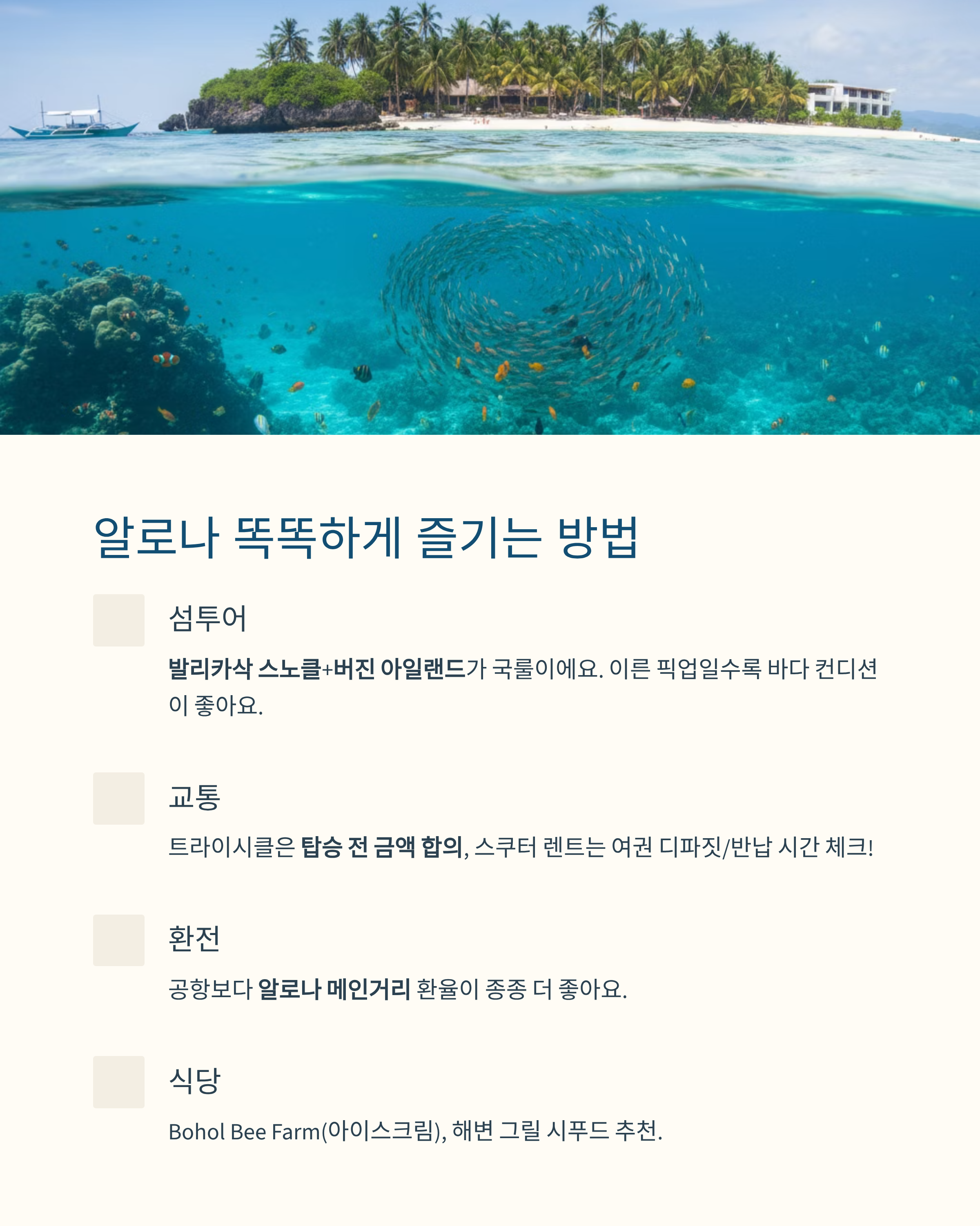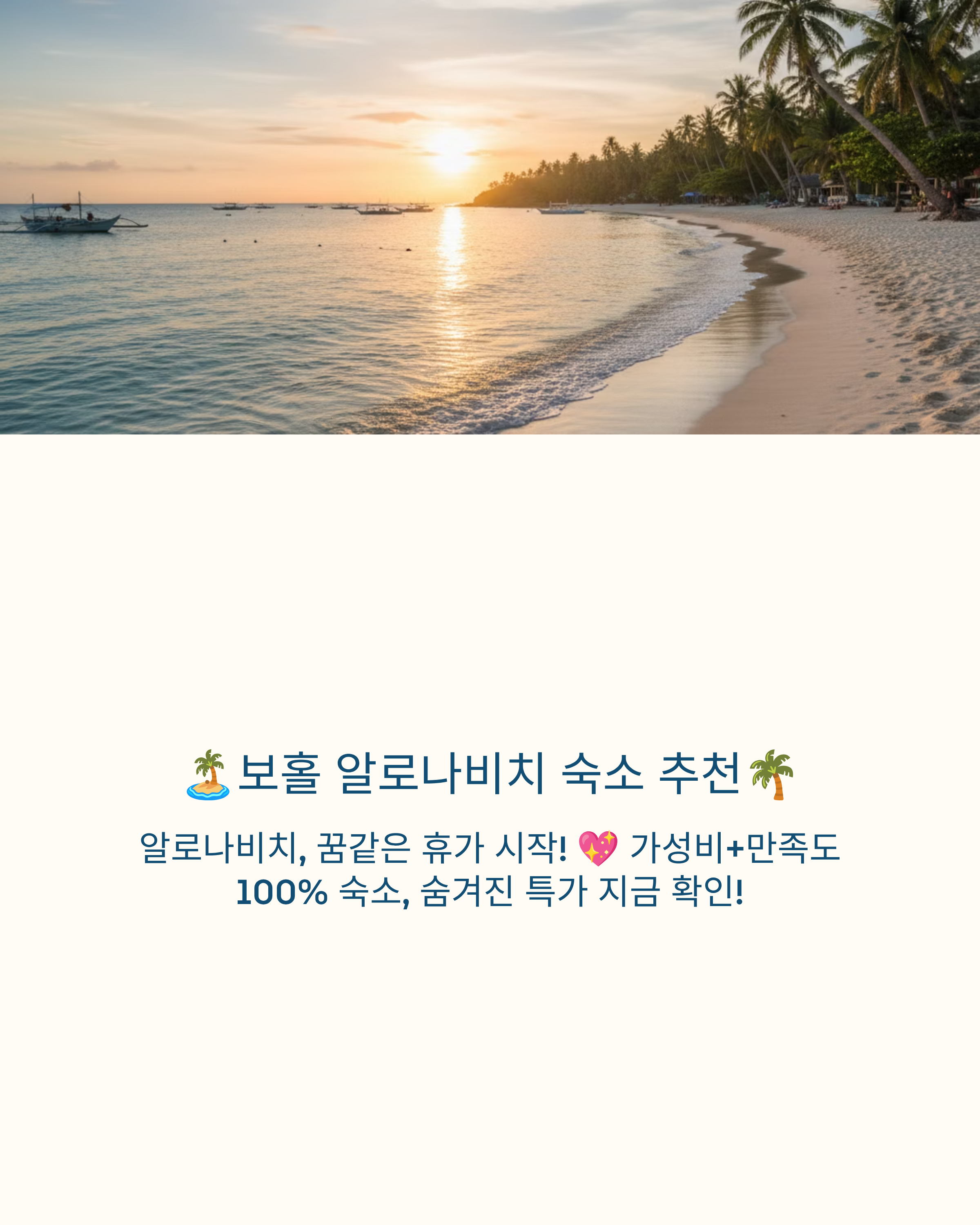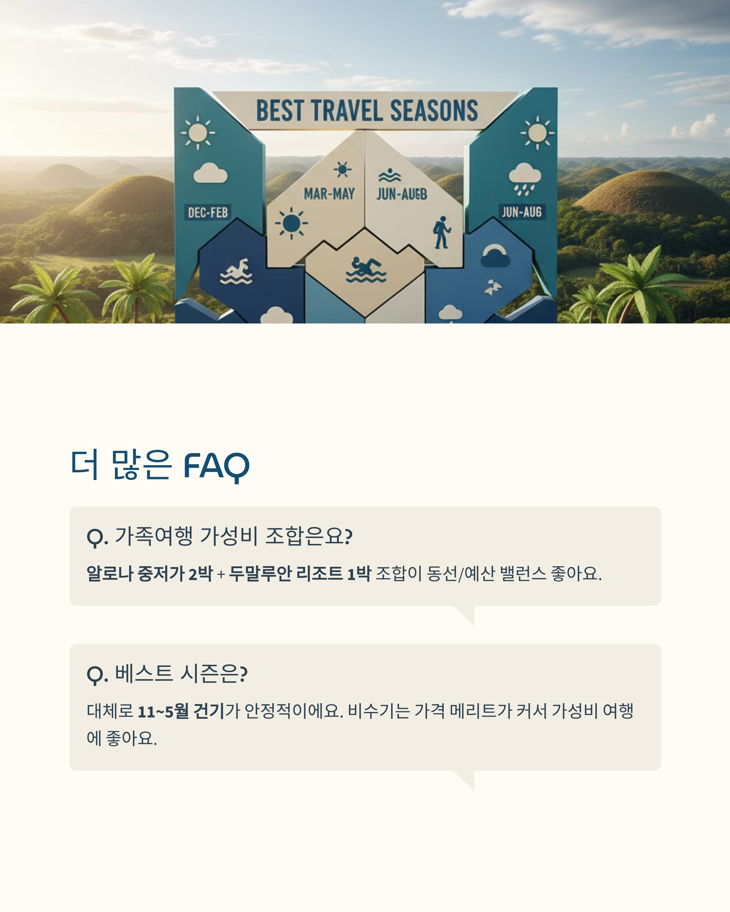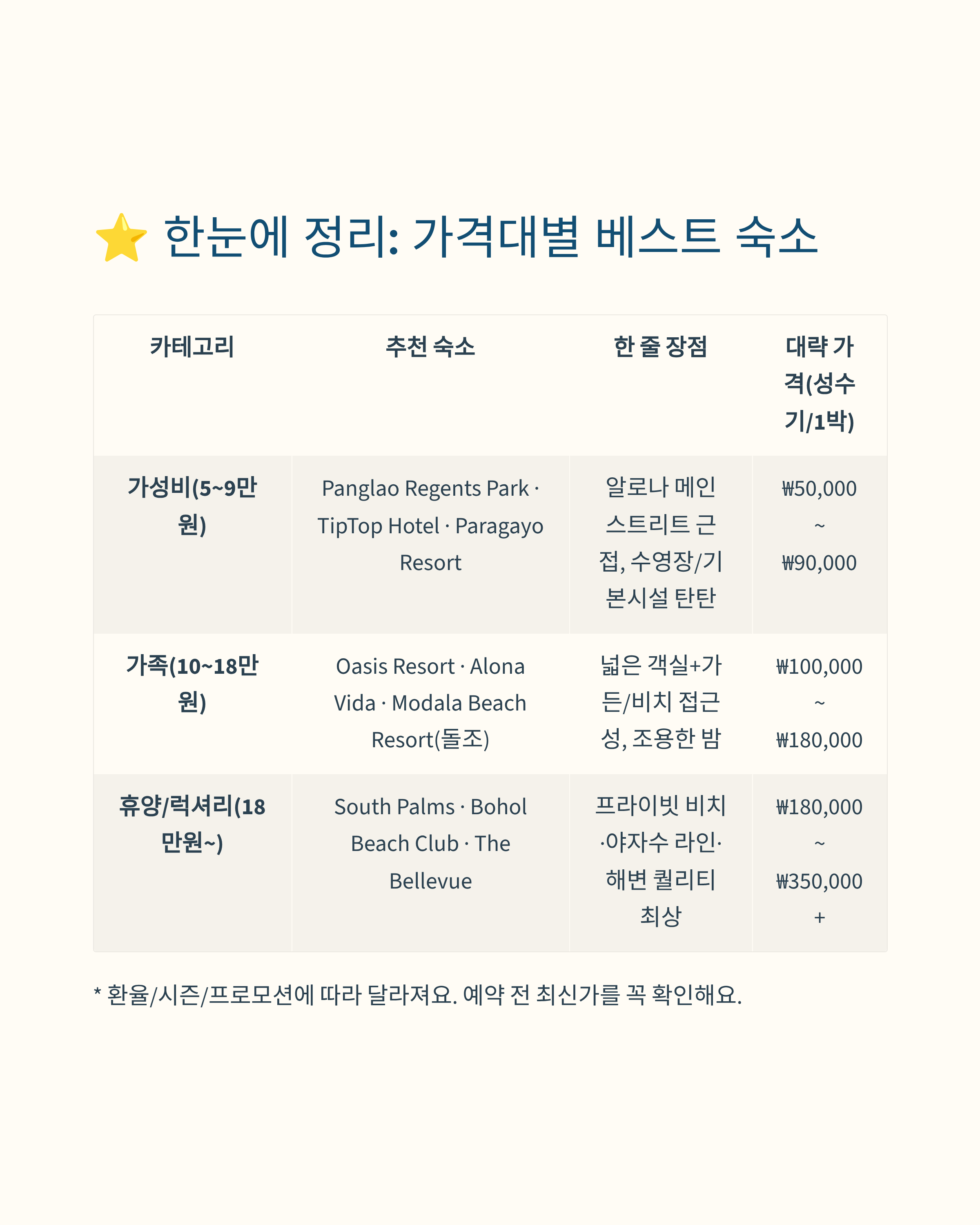 | 가족(10~18만원) | Oasis Resort · Alona Vida · Modala Beach Resort(돌조) | 넓은 객실+가든/비치 접근성, 조용한 밤 | ₩100,000 ~ ₩180,000 |