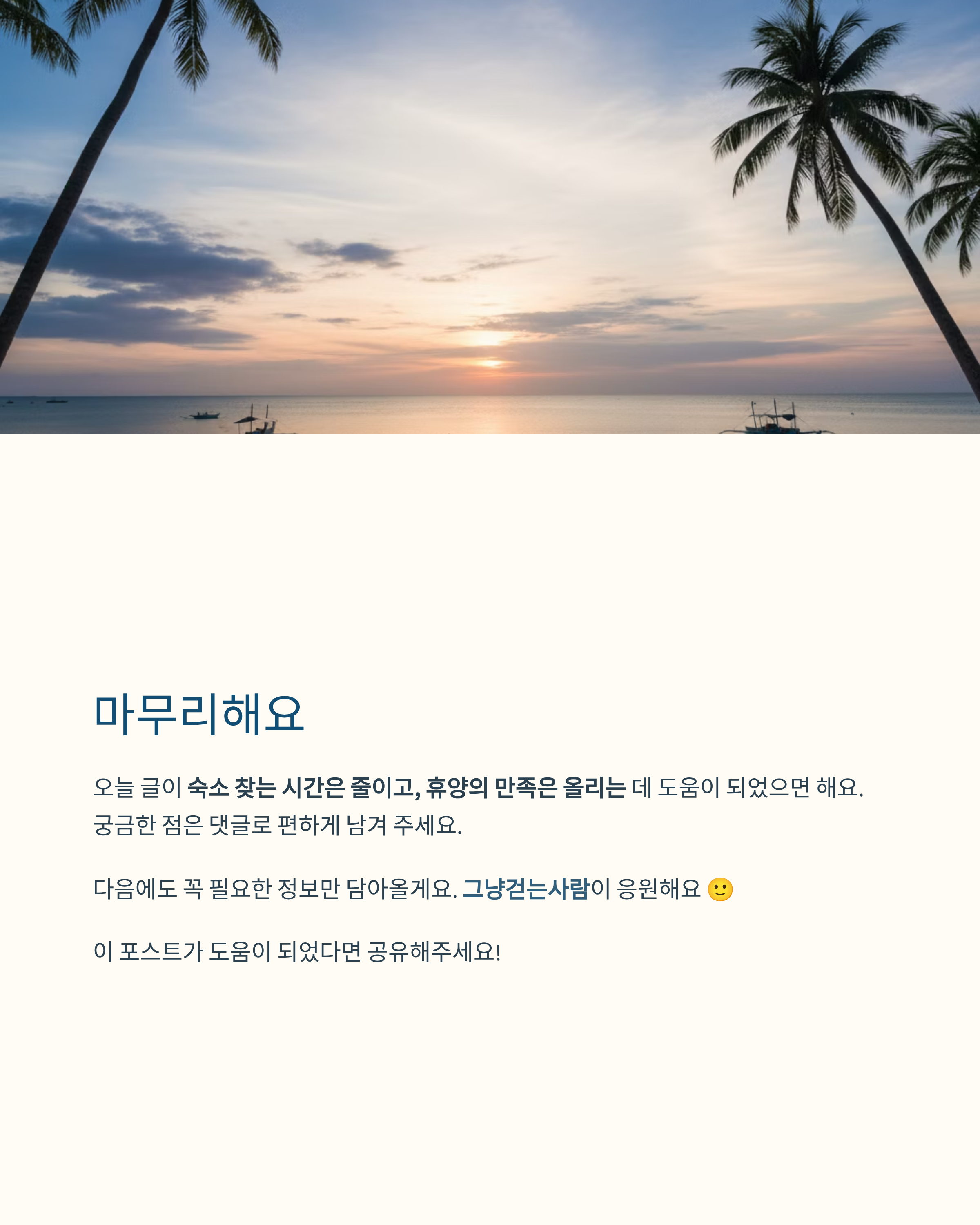 오늘 글이 숙소 찾는 시간은 줄이고, 휴양의 만족은 올리는 데 도움이 되었으면 해요. 궁금한 점은 댓글로 편하게 남겨 주세요. 다음에도 꼭 필요한 정보만 담아올게요. 그냥걷는사람이 응원해요 🙂