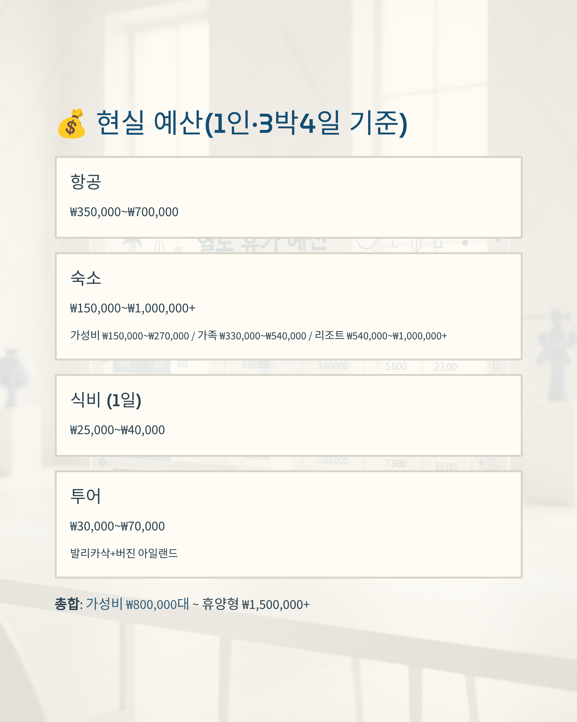 - 숙소 : 가성비 ₩15만~27만 / 가족 ₩33만~54만 / 리조트 ₩54만~100만+