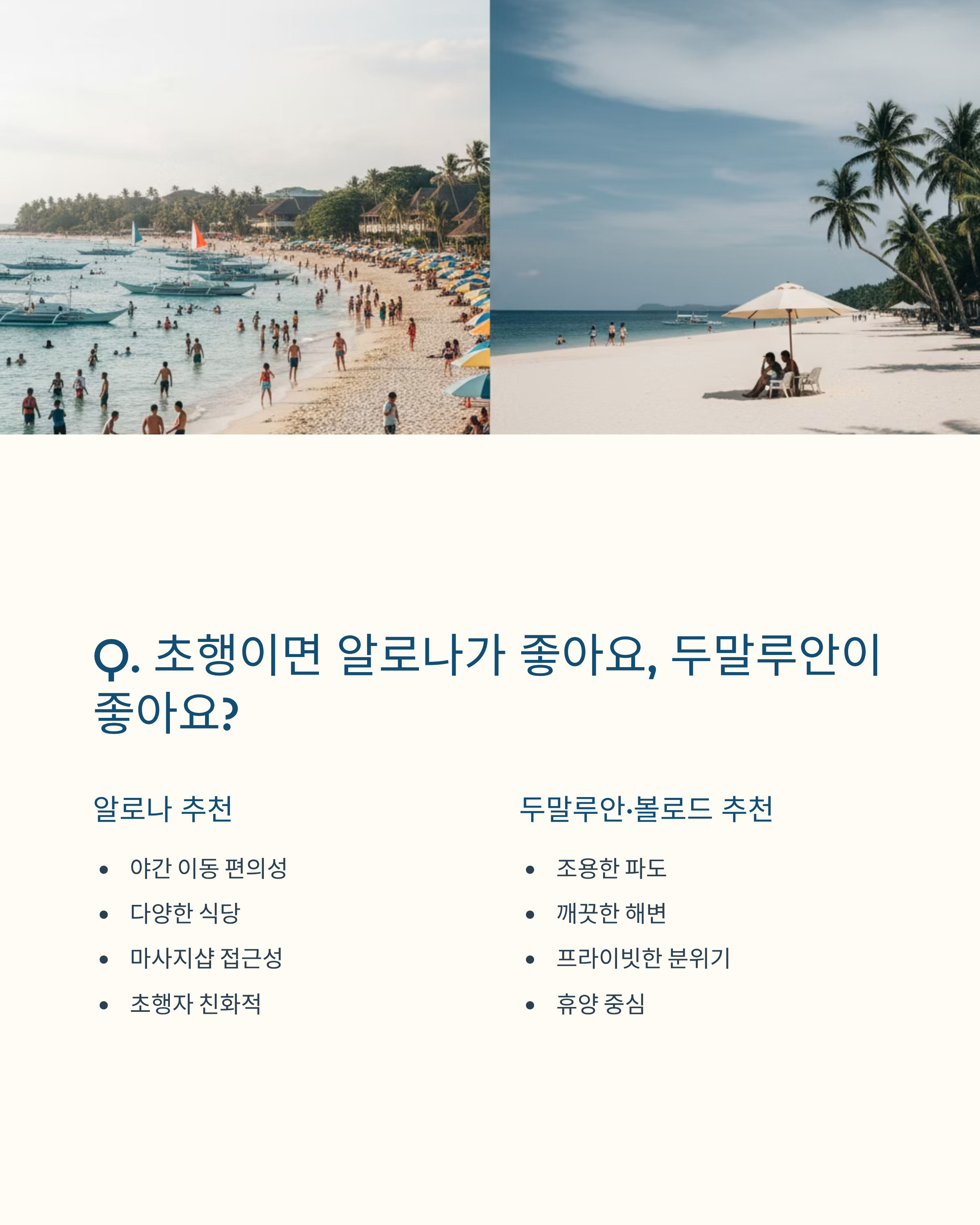 야간 이동/식당/마사지 편의성을 원하면 알로나, 조용한 파도와 깨끗한 해변을 원하면 두말루안·볼로드가 좋아요.