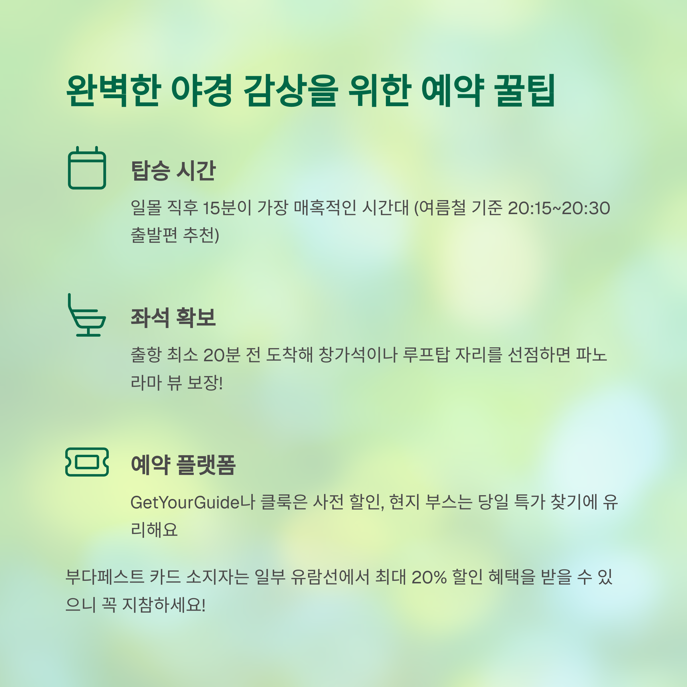 | 탑승 시간 추천 | 일몰 15분 전(여름 기준 20:15~20:30) |