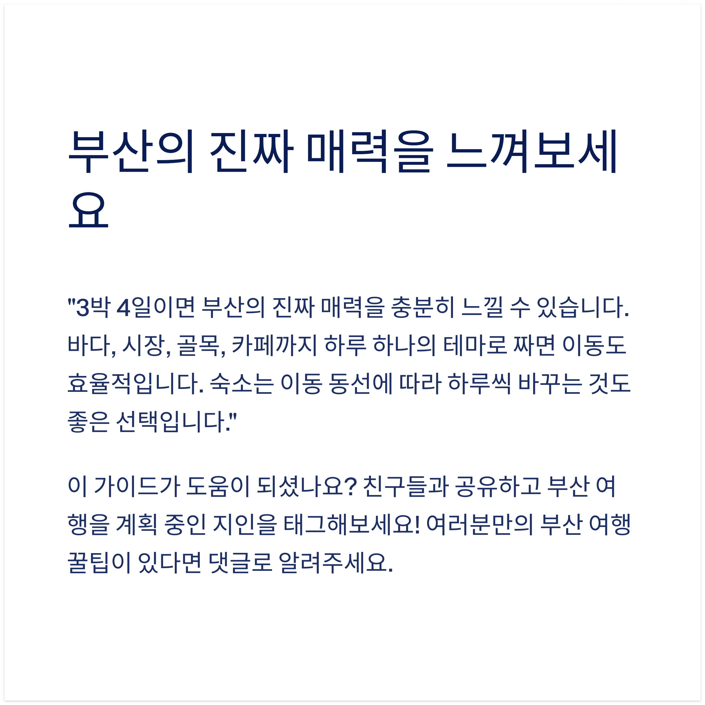 "3박 4일이면 부산의 진짜 매력을 충분히 느낄 수 있습니다"