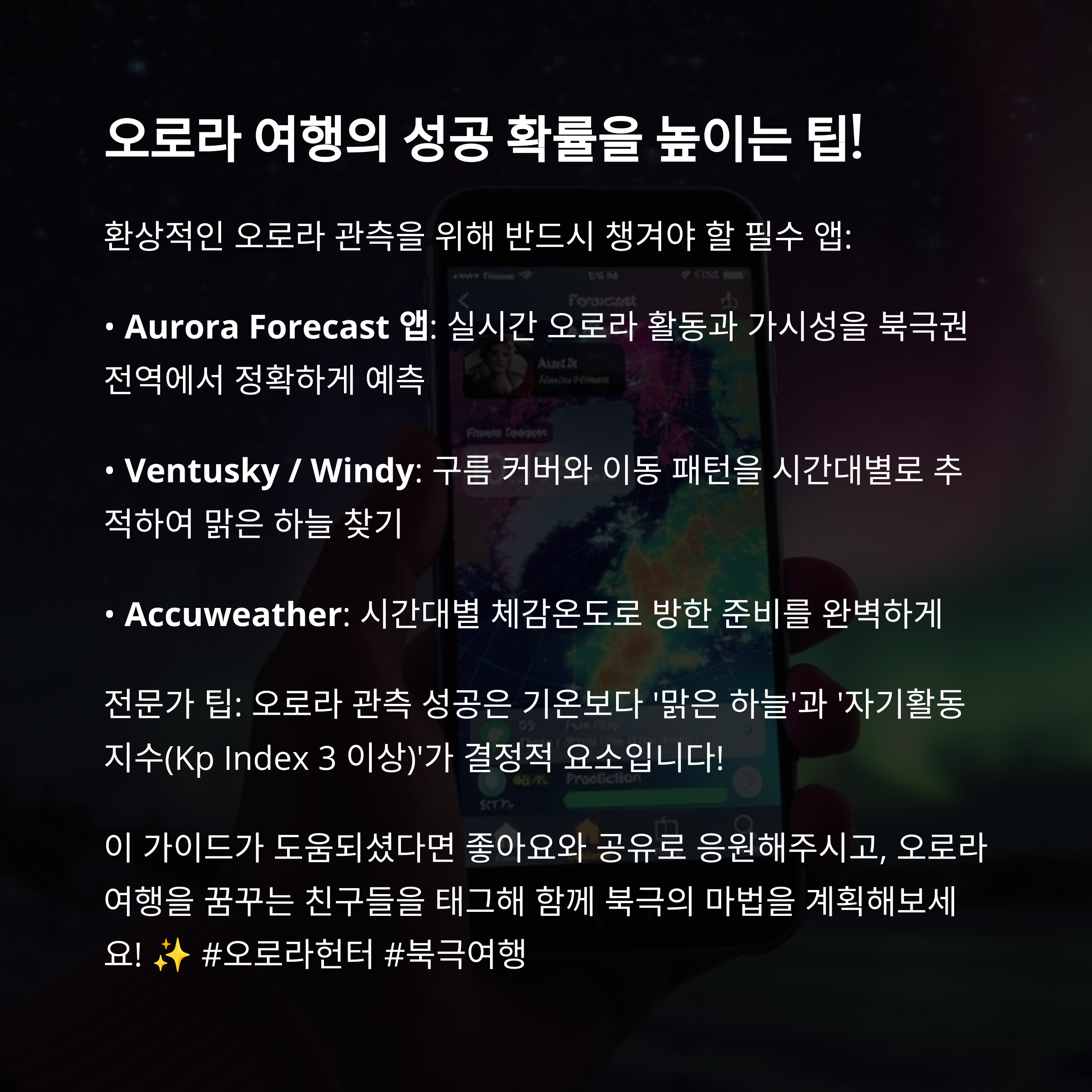 - Aurora Forecast 앱: 북극권 예보 실시간 확인