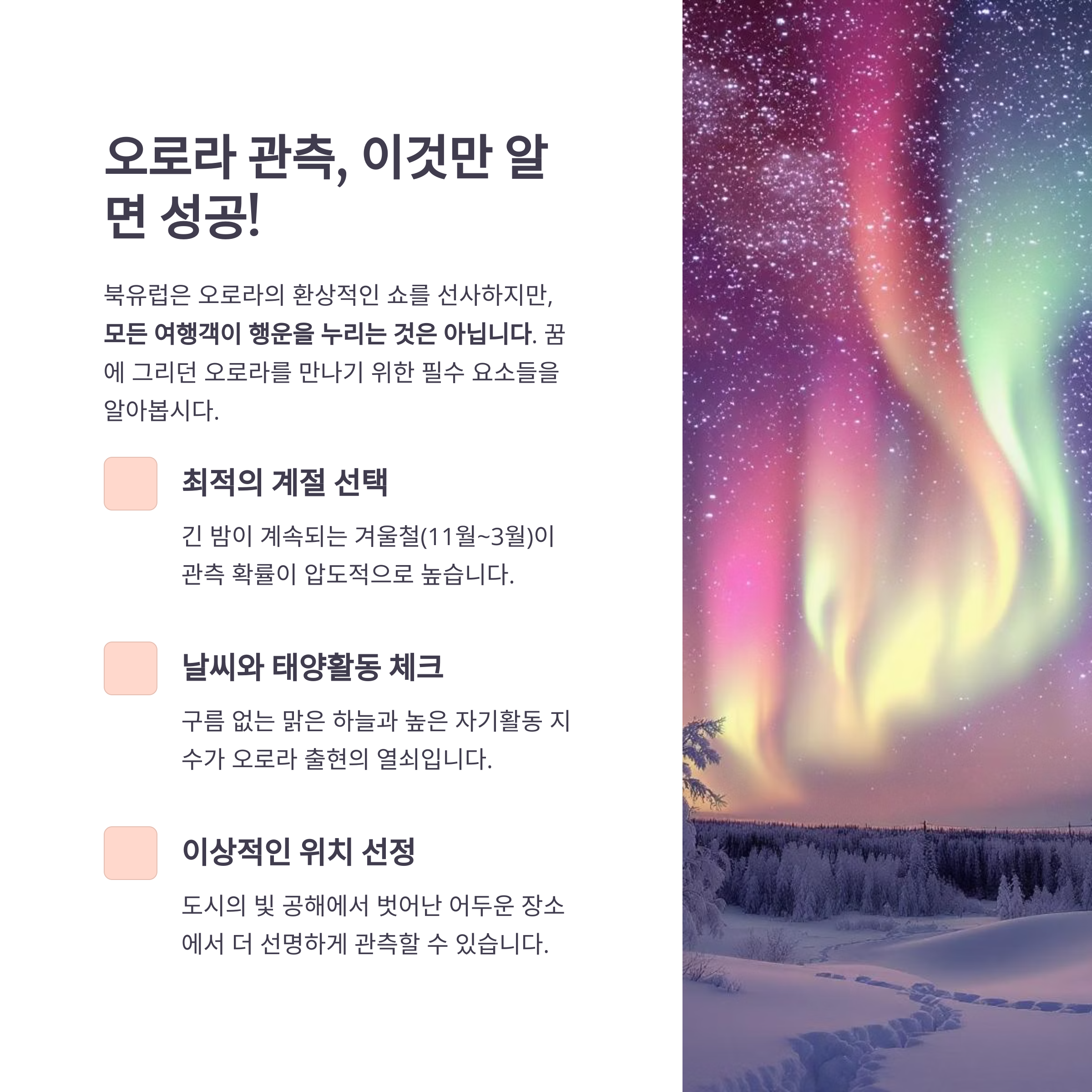 계절, 날씨, 위치, 촬영 조건 등을 모두 고려해야 오로라를 제대로 감상하고 담을 수 있어요.