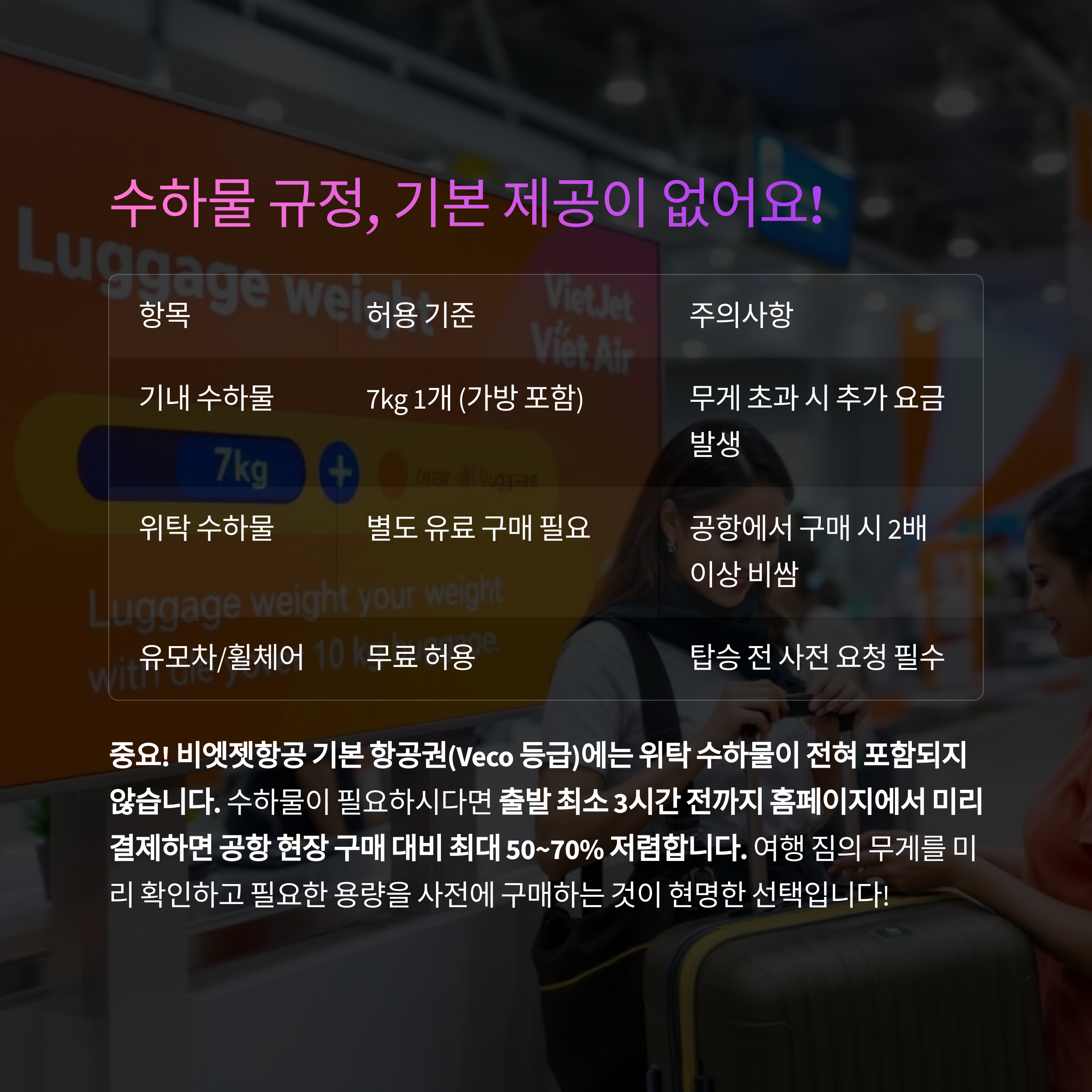 | 위탁 수하물 | 별도 유료 구매 필요 | 공항 구매 시 요금 높음 |