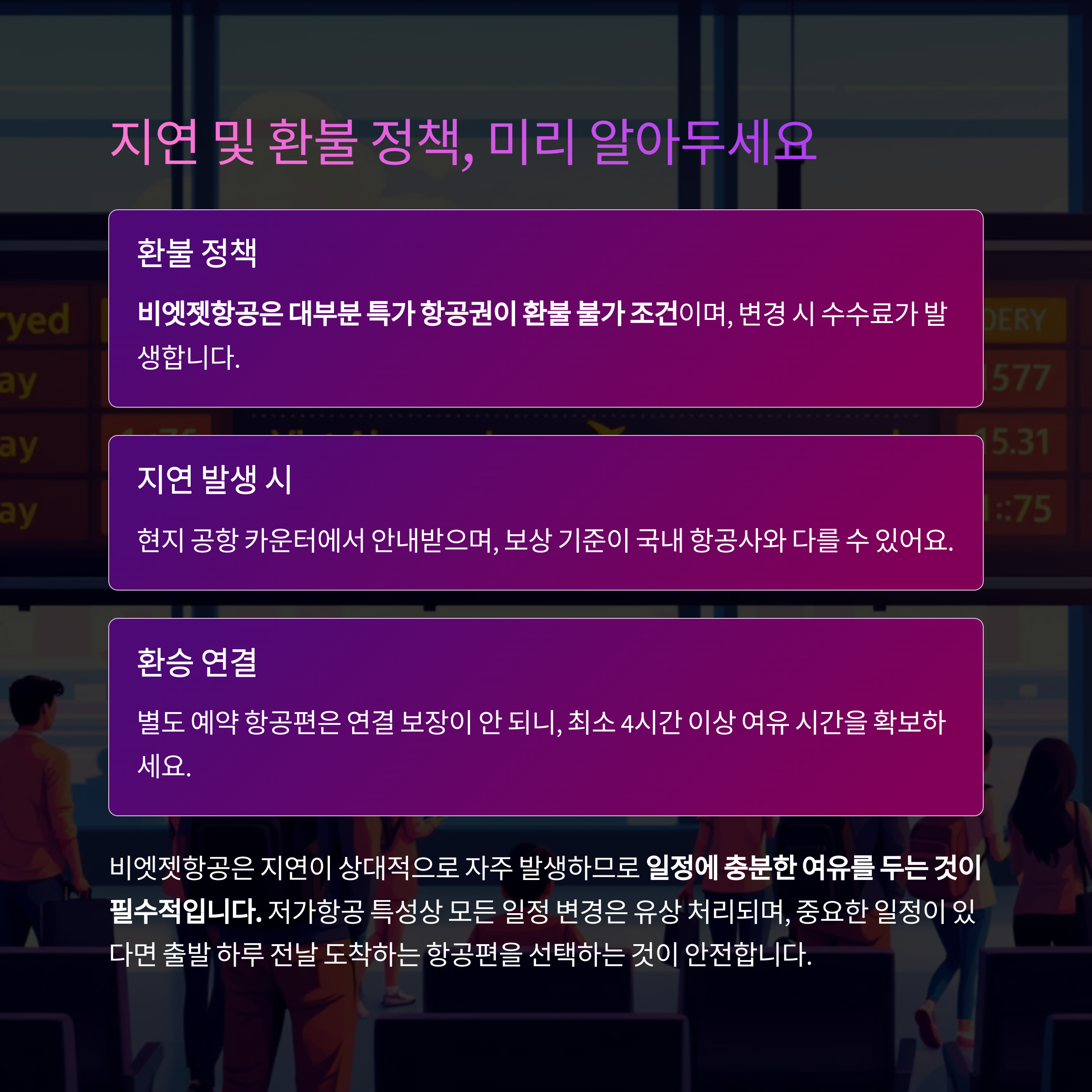 | 환승 연결 | 보장 안 됨, 별도 항공권은 여유 시간 확보 필요 |