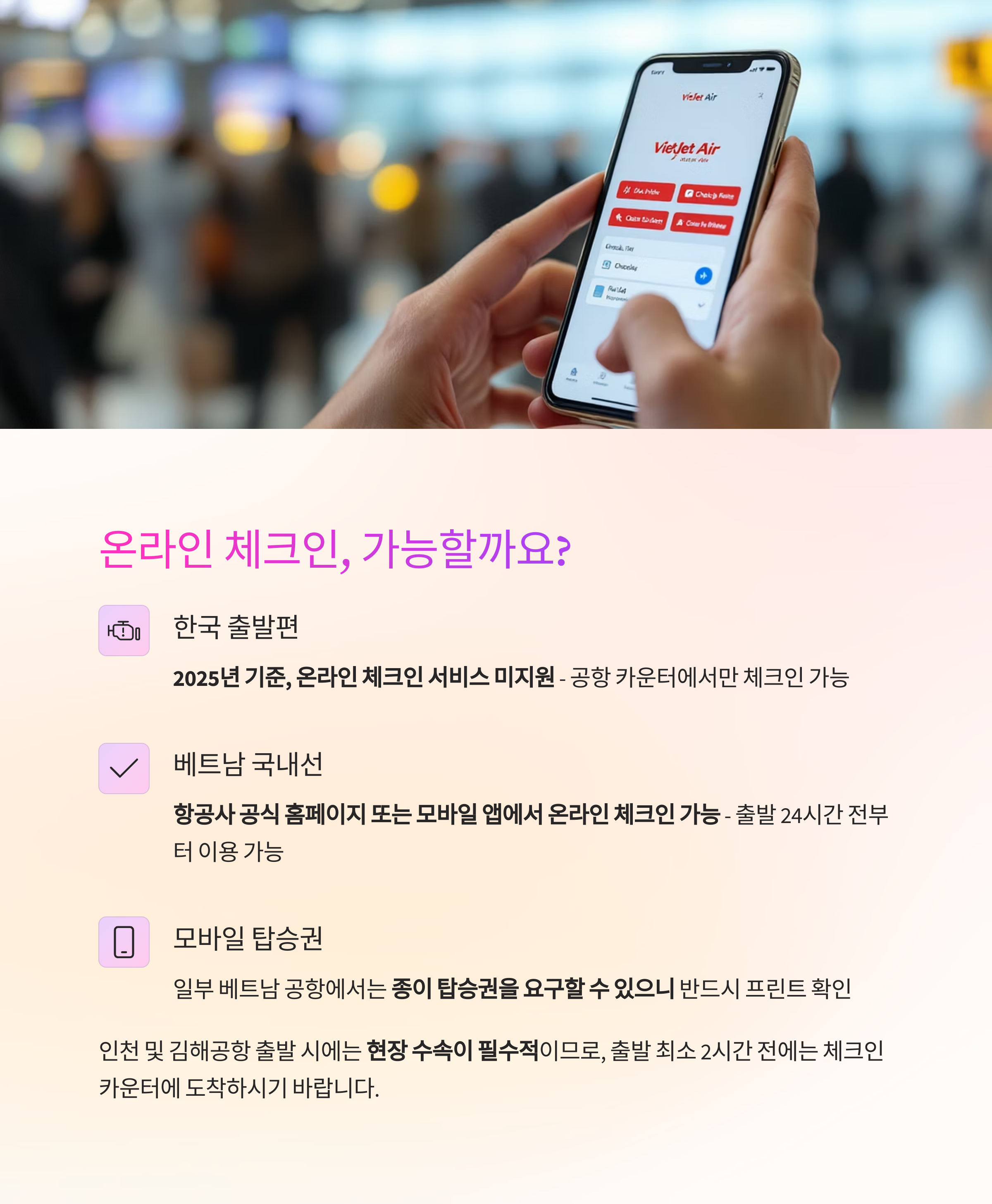 2025년 기준, 비엣젯항공은 한국 출발편은 온라인 체크인이 지원되지 않아요.