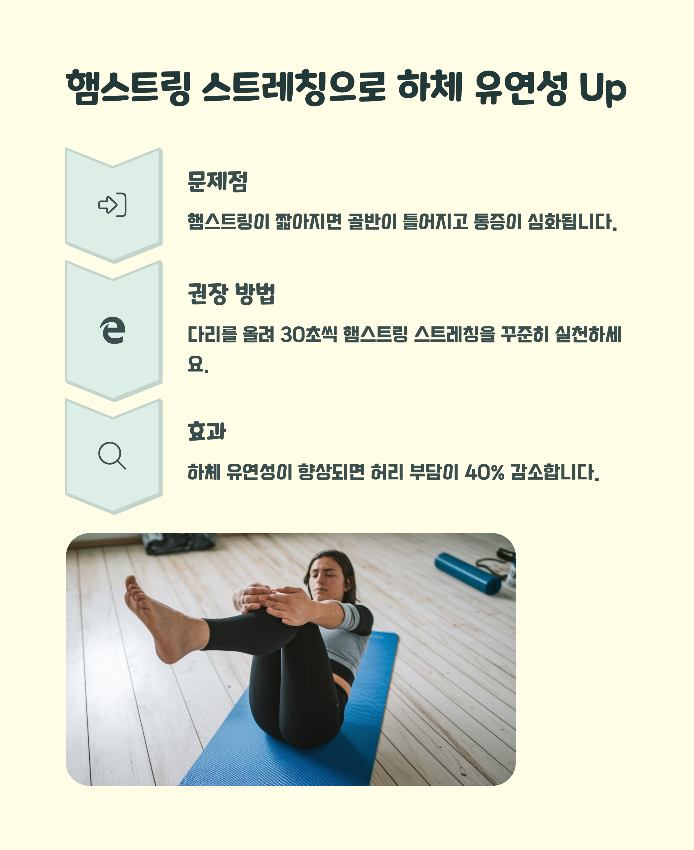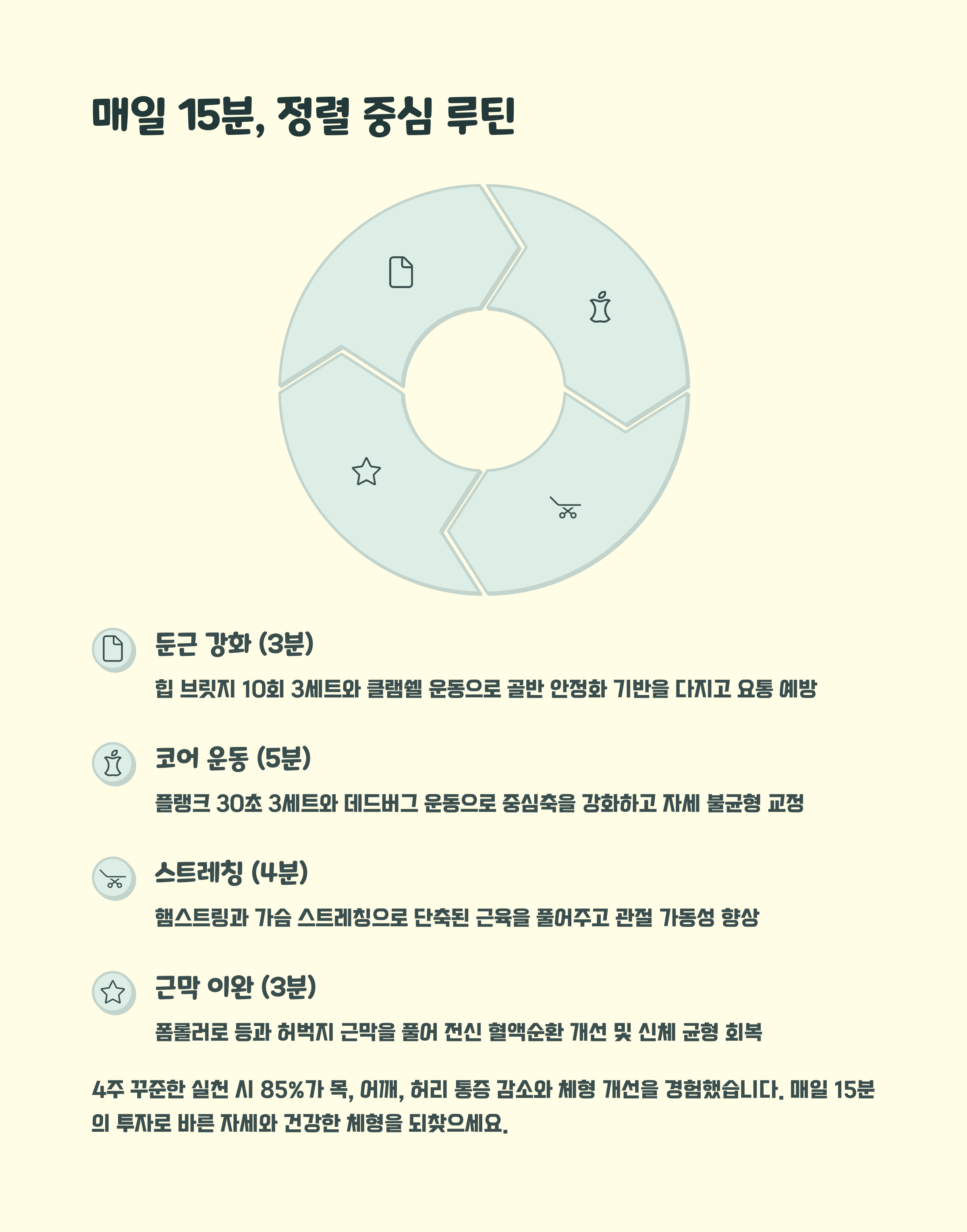 | 특정 근육만 과도하게 사용됨, 잘못된 자세 습관 | 둔근 강화, 어깨 열기, 햄스트링 스트레칭 | 매일 10~15분 고정 루틴, 좌우 밸런스 인식하기 |