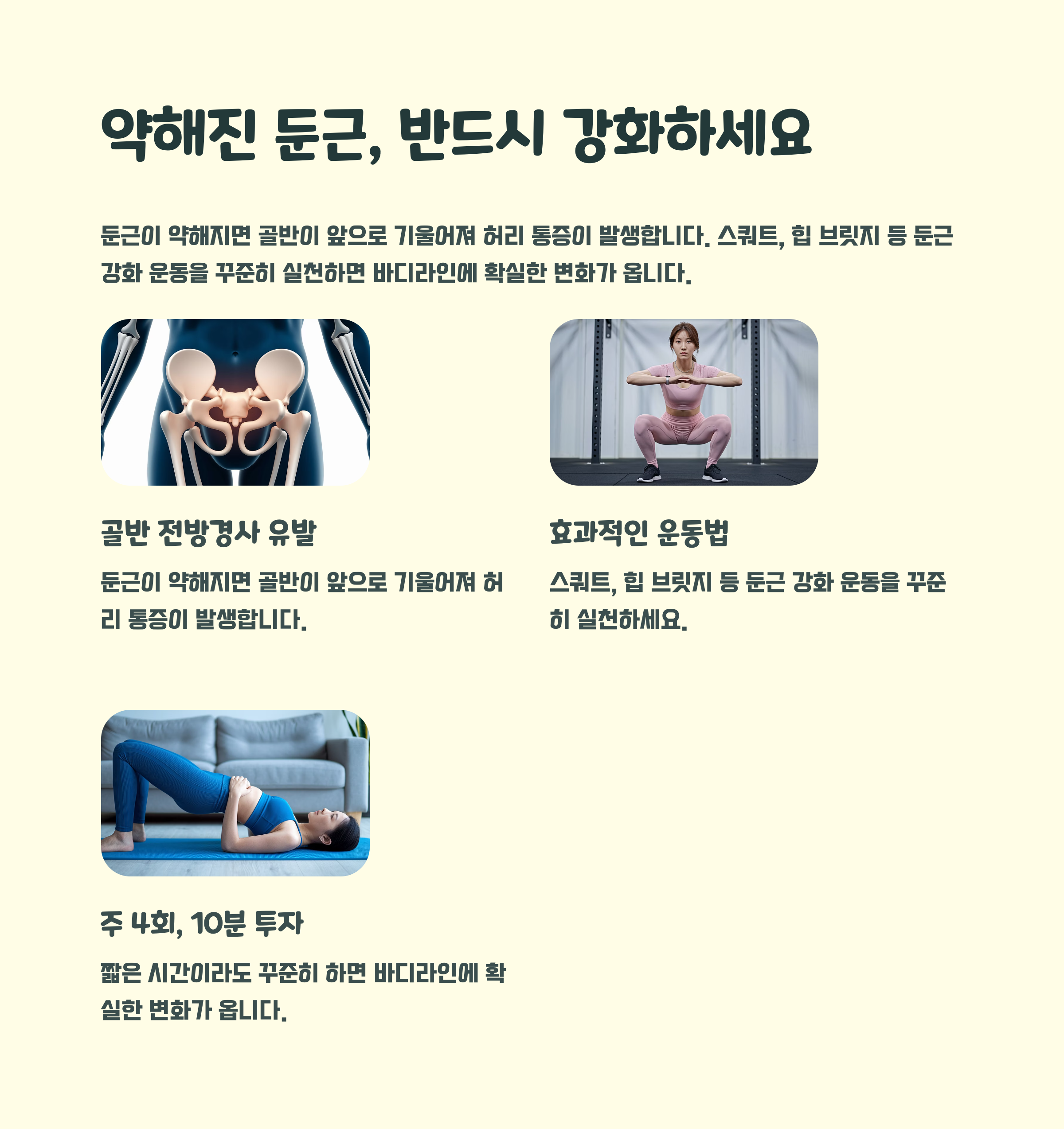 | 특정 근육만 과도하게 사용됨, 잘못된 자세 습관 | 둔근 강화, 어깨 열기, 햄스트링 스트레칭 | 매일 10~15분 고정 루틴, 좌우 밸런스 인식하기 |