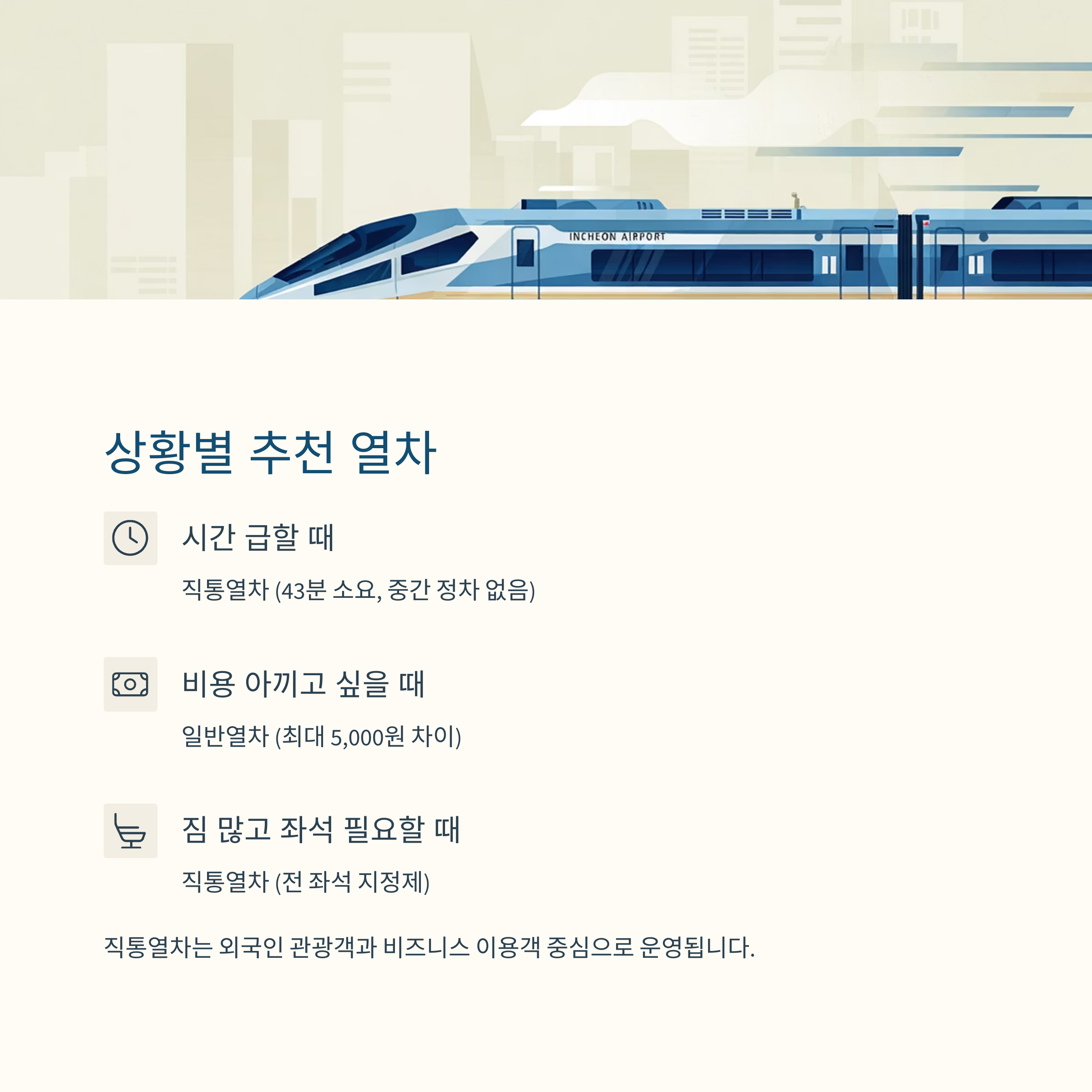 - 짐 많고 좌석 확보 필요 → 직통열차는 전 좌석 지정제