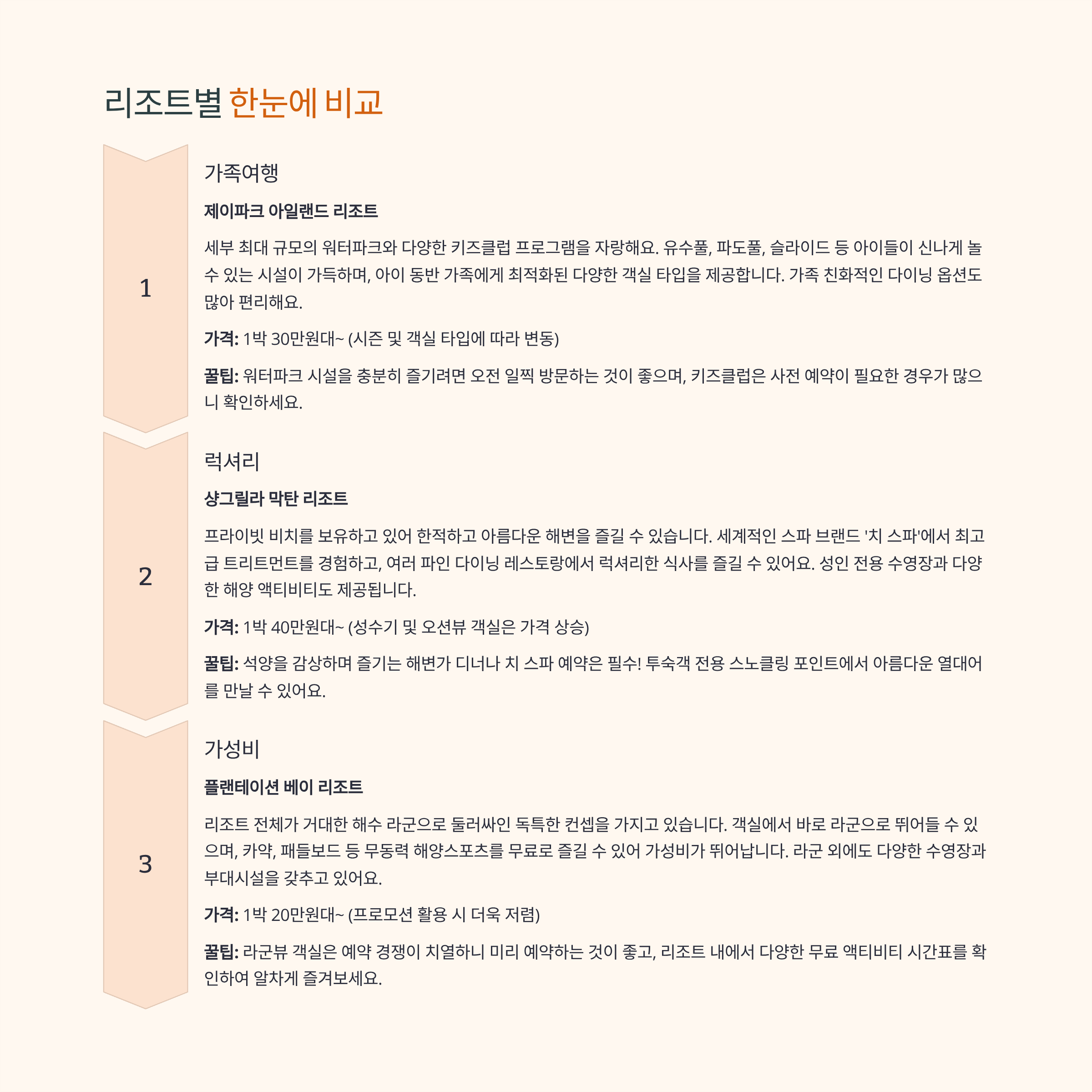 - 주요 시설: 아이를 위한 워터파크나 키즈클럽이 필요한가요, 아니면 조용한 프라이빗 비치가 더 중요한가요?