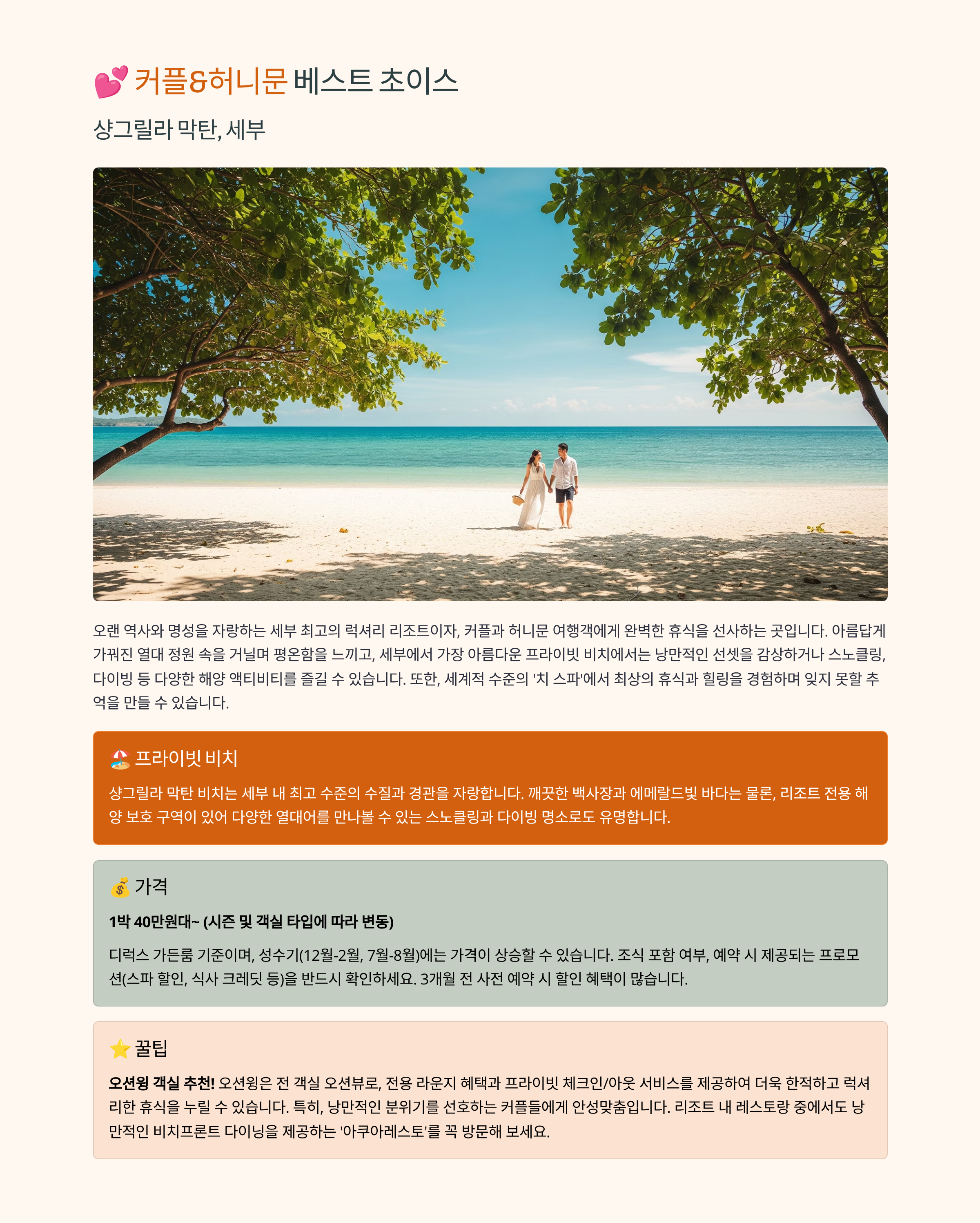- 특징: 아름다운 프라이빗 비치, 최고급 스파, 훌륭한 서비스