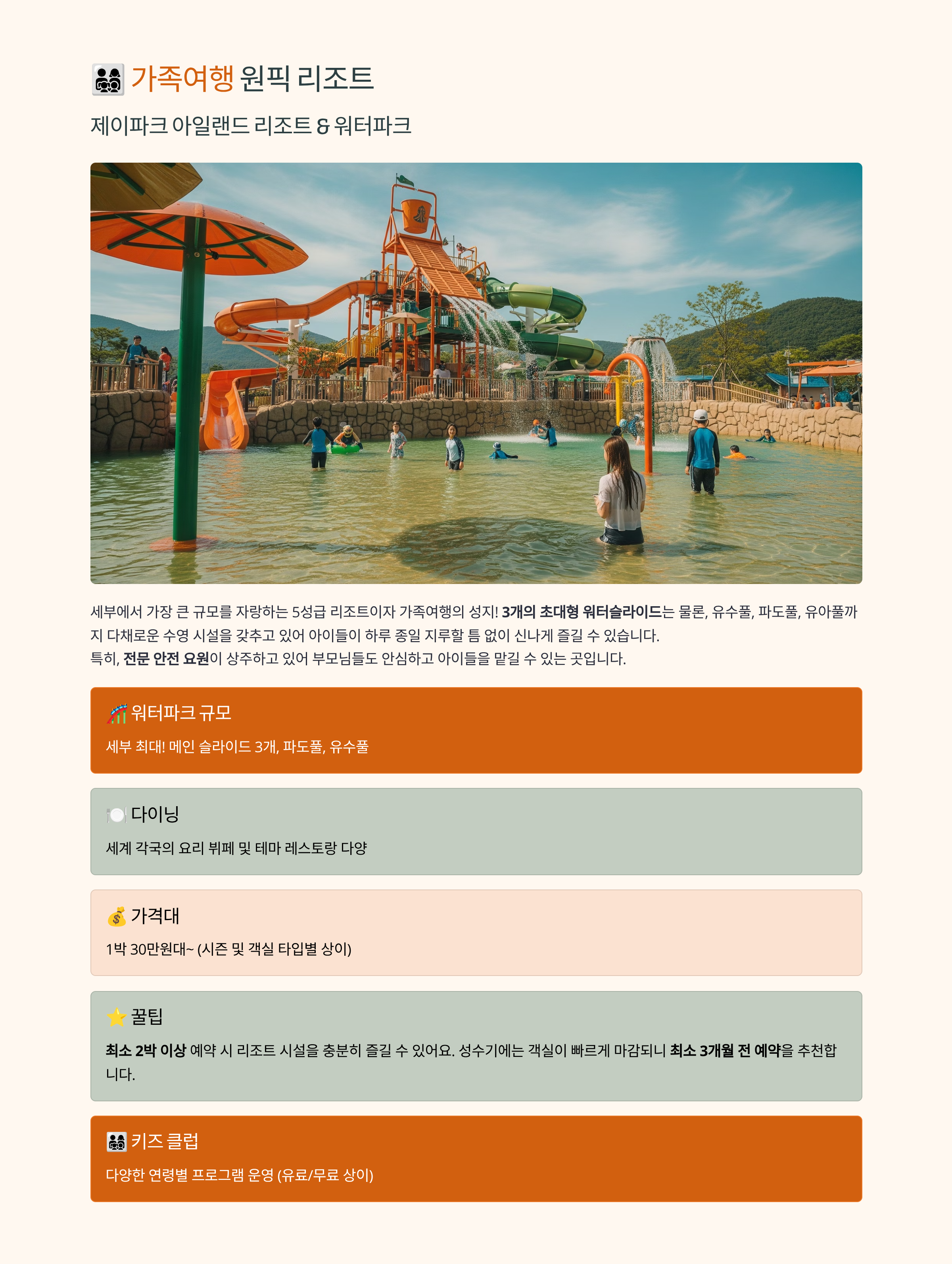 - 특징: 대규모 워터파크, 키즈 클럽, 뽀로로 테마파크