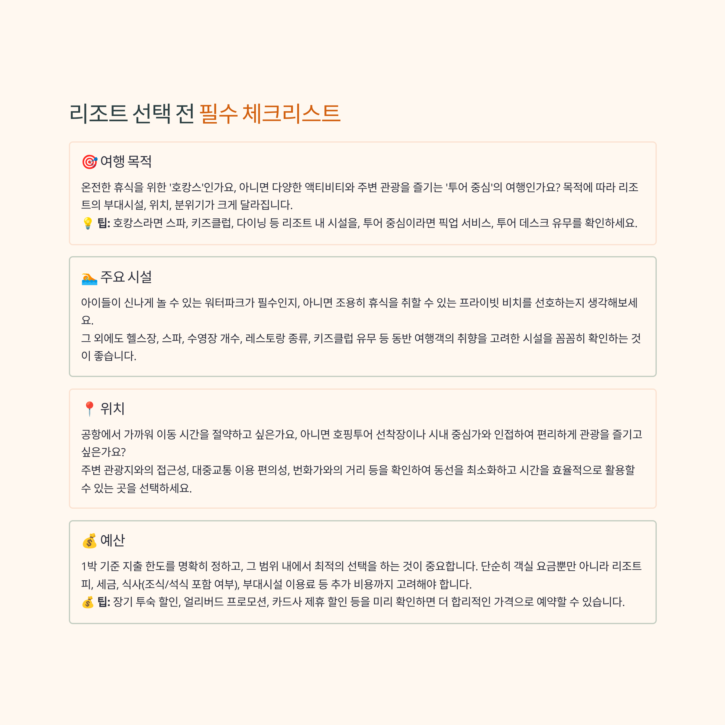 무작정 남들이 좋다는 곳을 예약하기 전에, 나의 여행 스타일과 예산을 먼저 생각해보는 것이 중요해요. 아래 체크리스트를 통해 최고의 리조트를 찾아보세요!