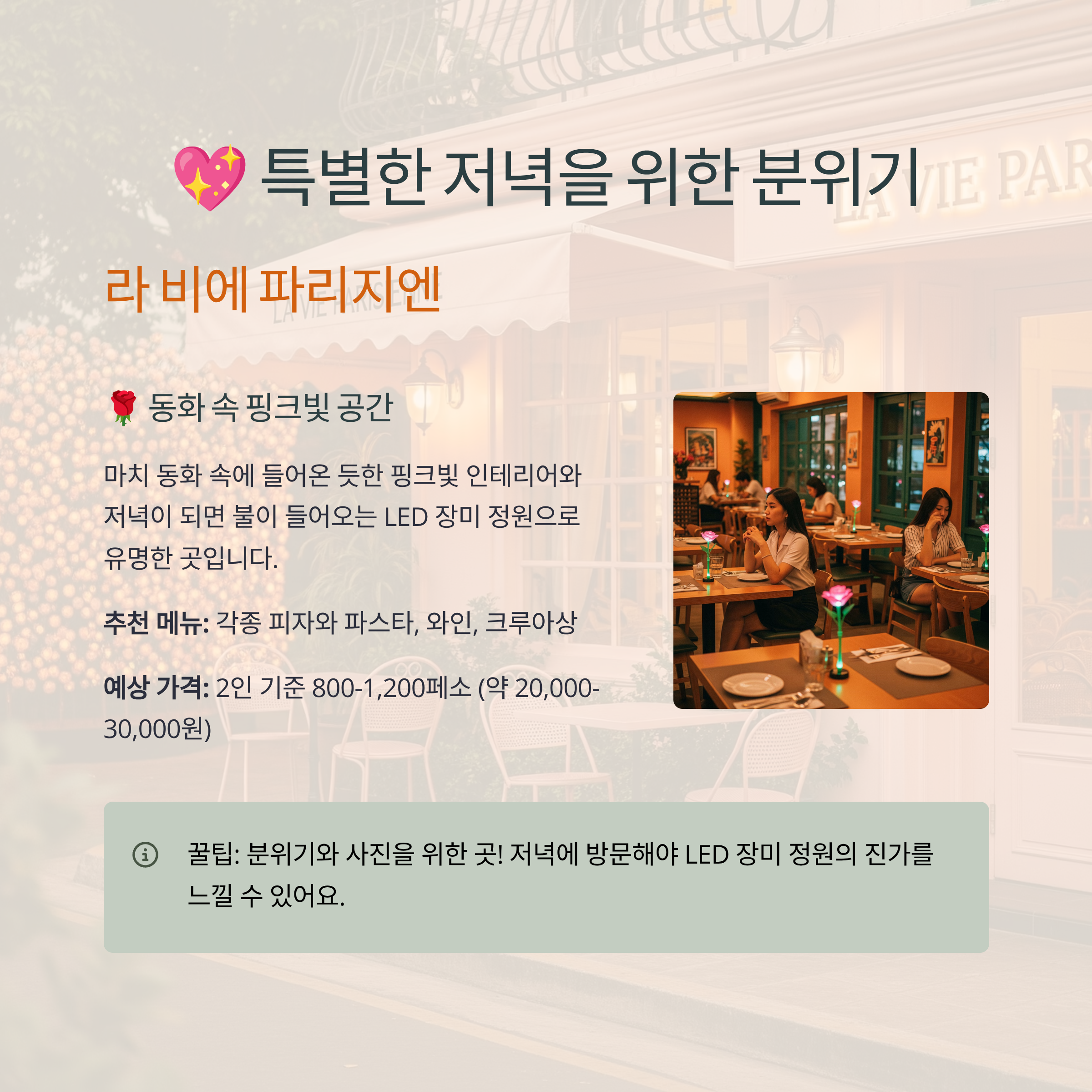 - 꿀팁: 음식 맛 자체보다는 독특한 분위기와 사진을 찍기 위해 방문하는 것을 추천해요. 특히 저녁에 방문해야 LED 장미 정원의 진가를 느낄 수 있습니다.