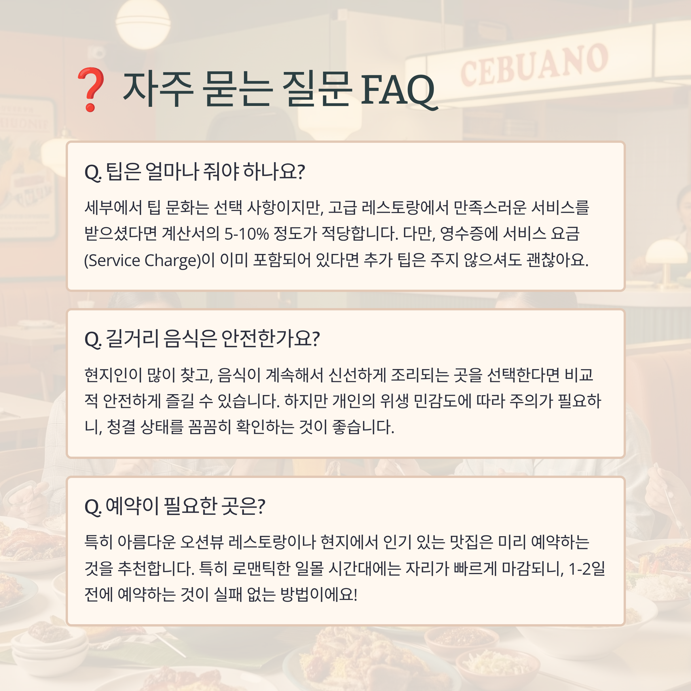 세부 맛집에 대해 여행자들이 가장 많이 궁금해하는 질문들을 모아봤어요.