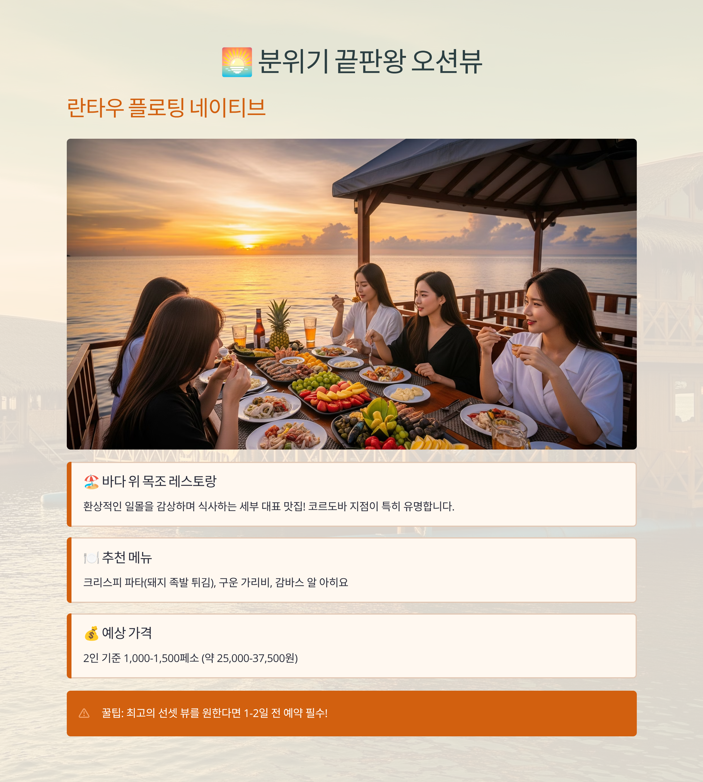 그래서 준비했습니다! 유명 관광지 식당부터 현지인들이 사랑하는 로컬 맛집까지, 제 기준에서 직접 엄선한 실패 없는 세부 맛집 리스트를 공개합니다. 이 글 하나로 여러분의 세부 미식 여행이 한층 더 풍요로워질 거예요!
