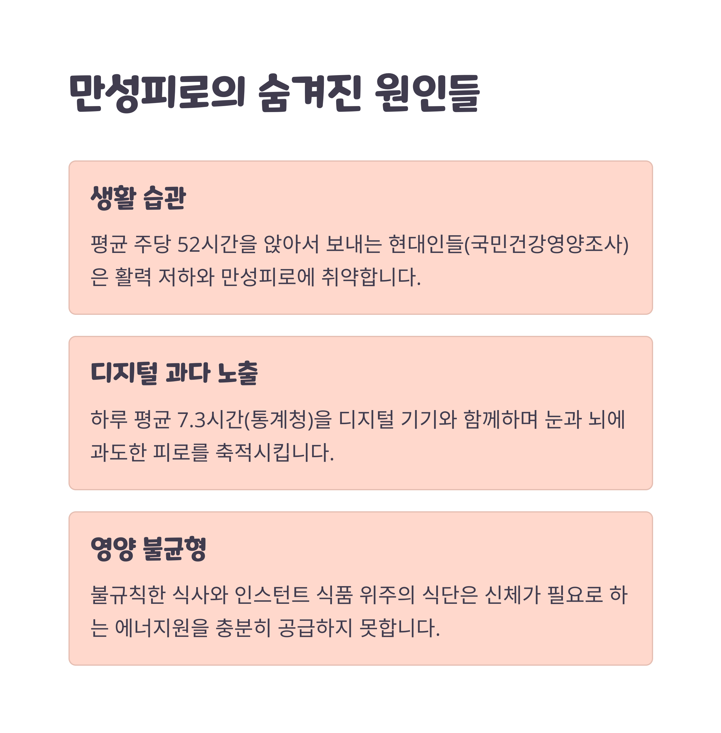 과도한 업무, 스트레스, 수면 부족, 영양 불균형이 만성피로를 부릅니다.