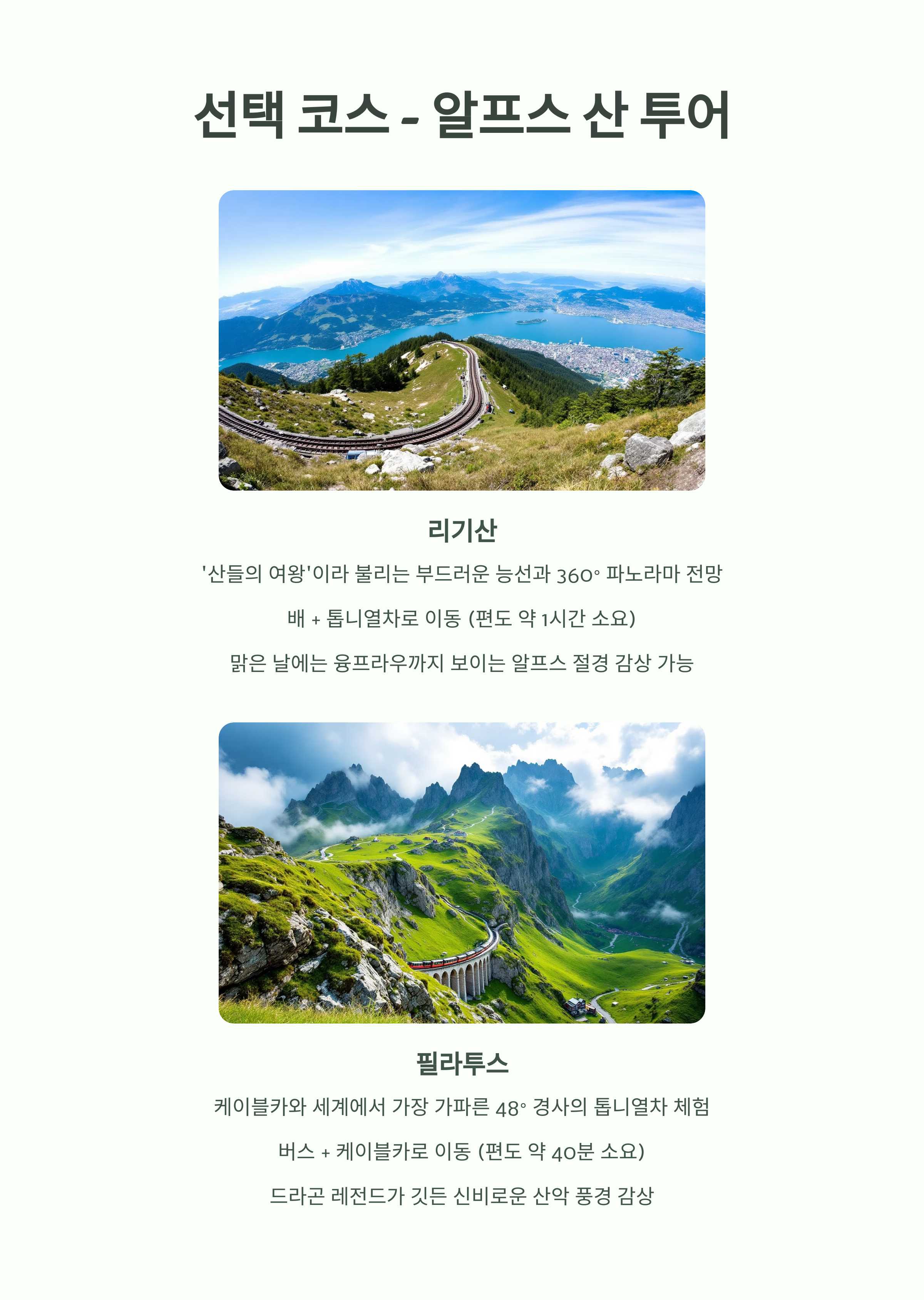 | 리기산 | ‘산들의 여왕’이라 불리는 부드러운 능선 | 배 + 톱니열차 |
