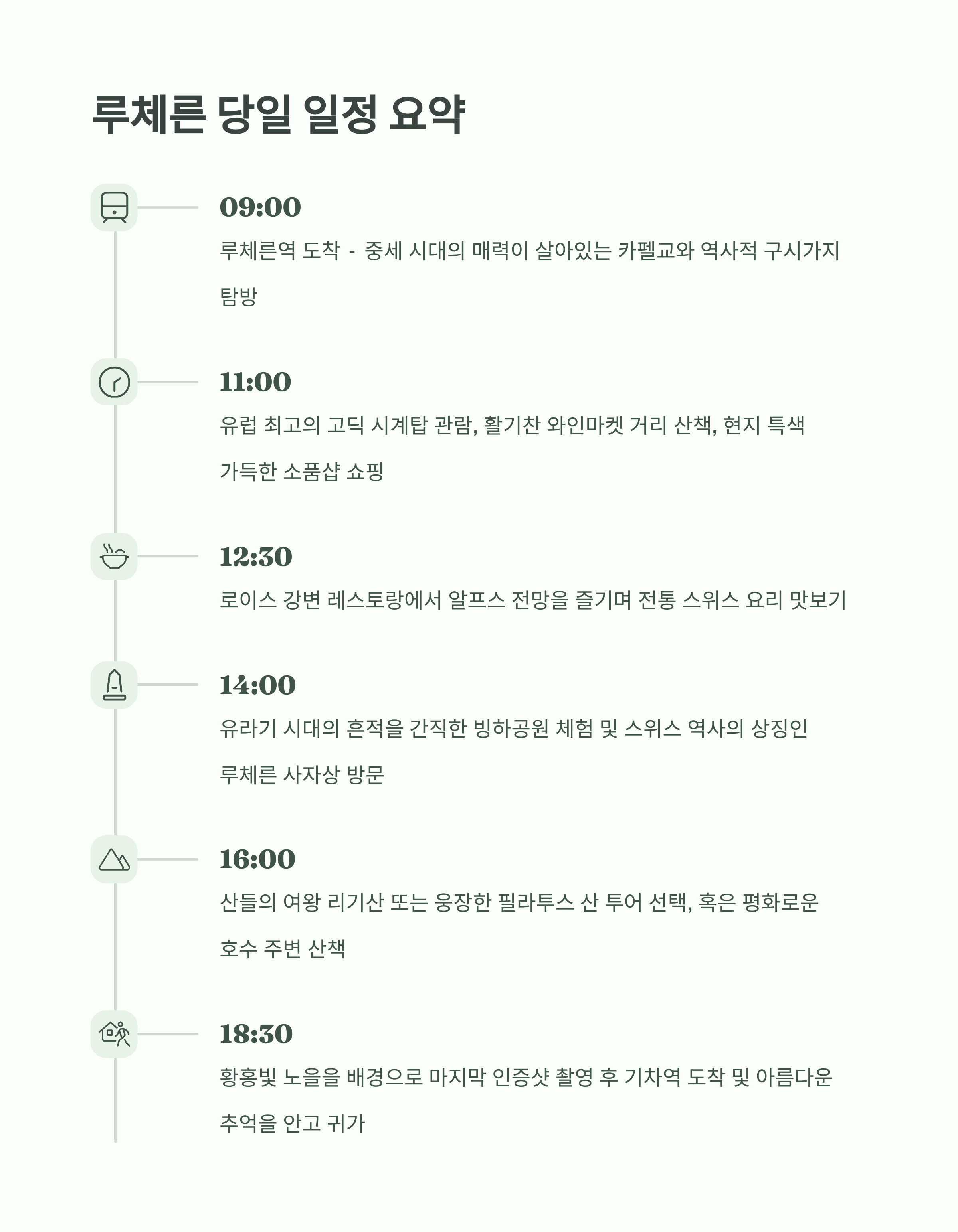 | 09:00 | 루체른역 도착 – 카펠교 & 구시가지 산책 |