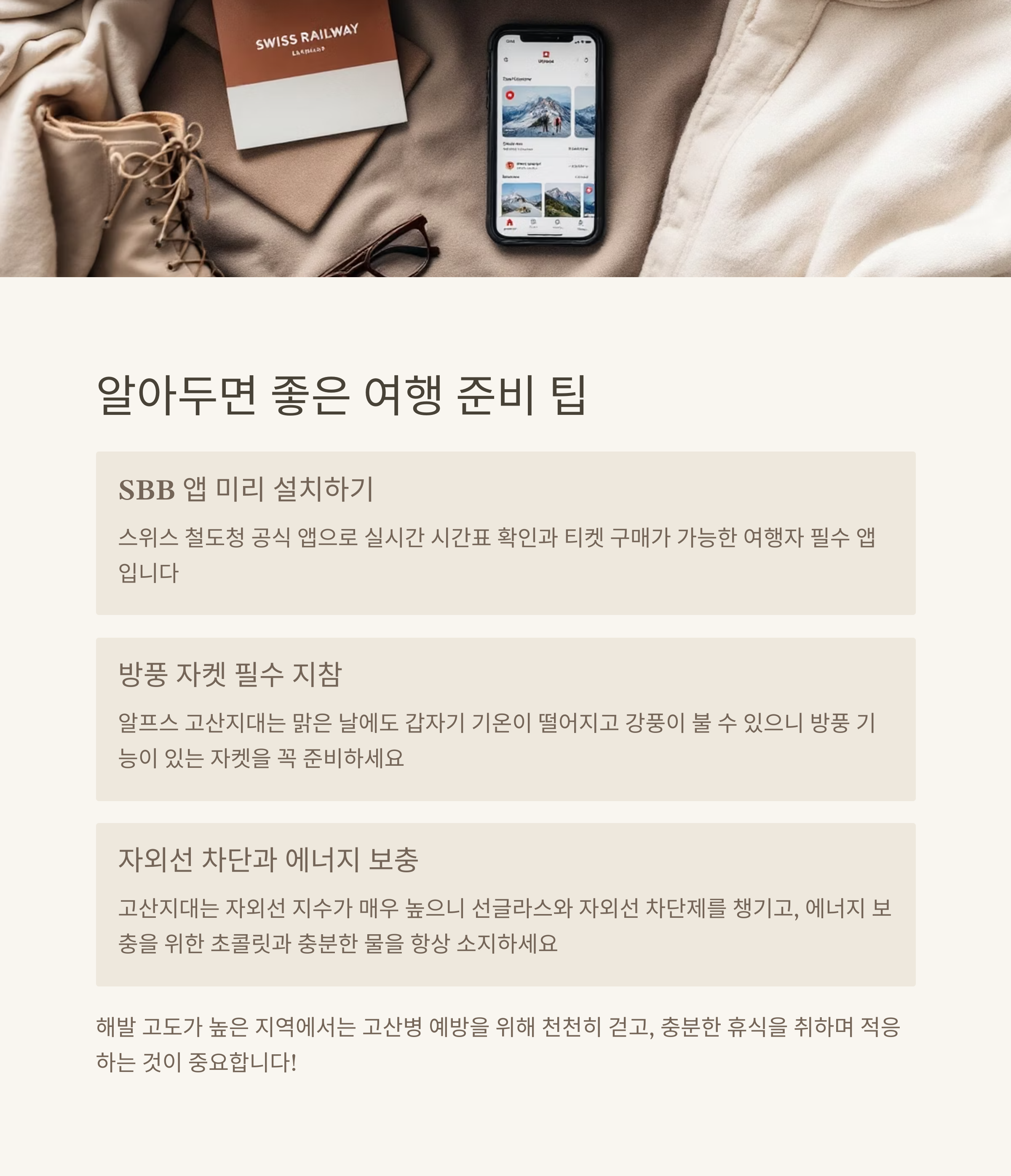 | 티켓 | 스위스패스 or 융프라우패스로 할인 가능 |