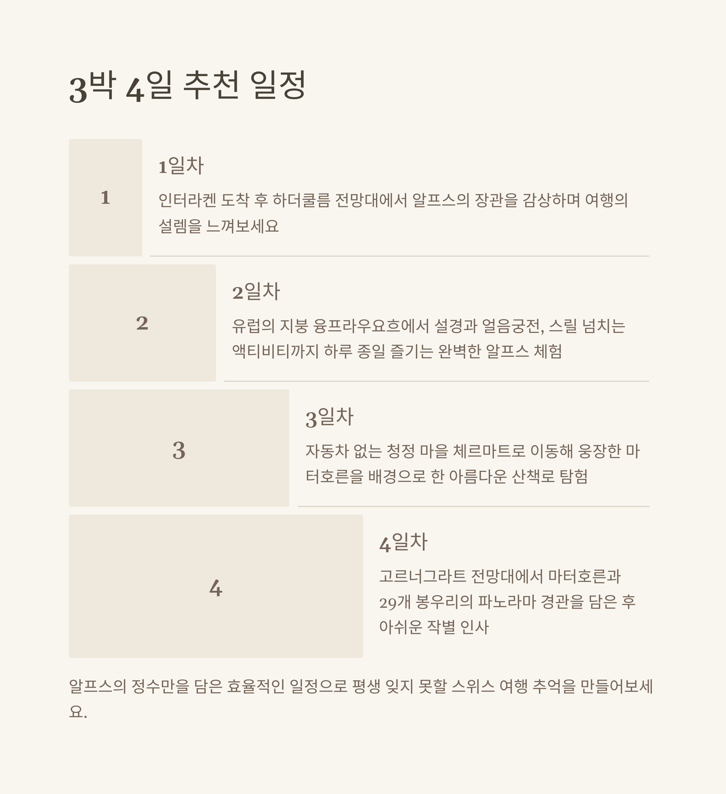 | 인터라켄 → 융프라우요흐 | 열차 + 산악열차 | 약 2시간 반 (편도) |