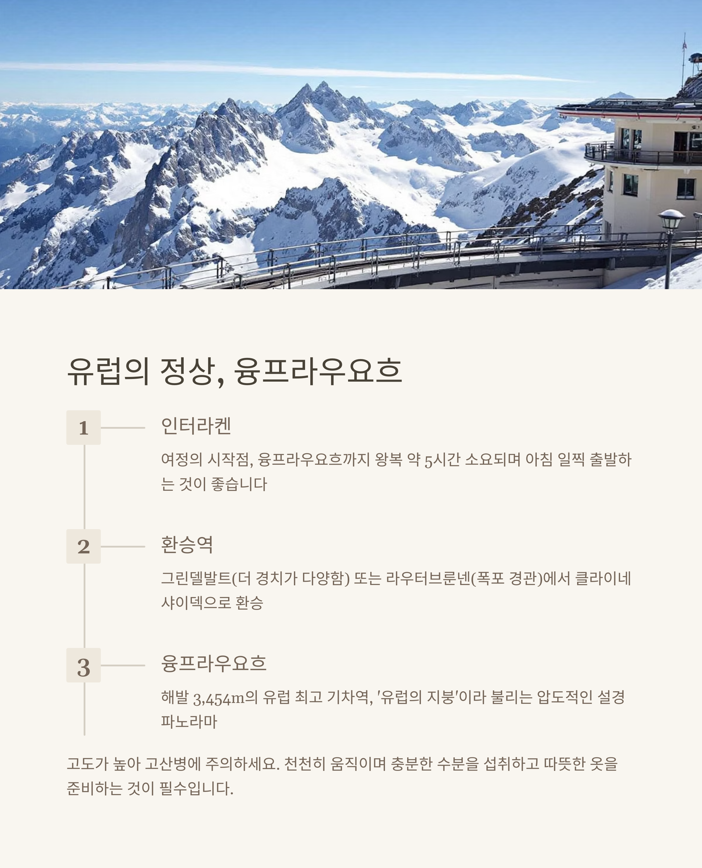 | 소요 시간 | 인터라켄 → 융프라우요흐 왕복 약 5시간 |