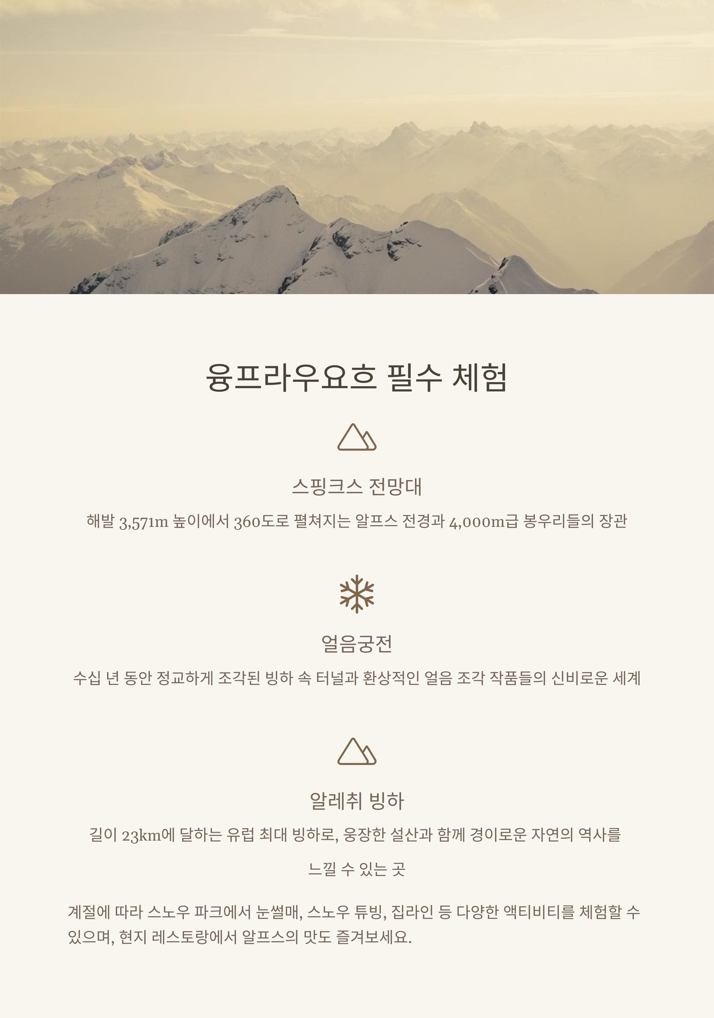스핑크스 전망대, 얼음궁전, 알레취 빙하 등을 만날 수 있어요.