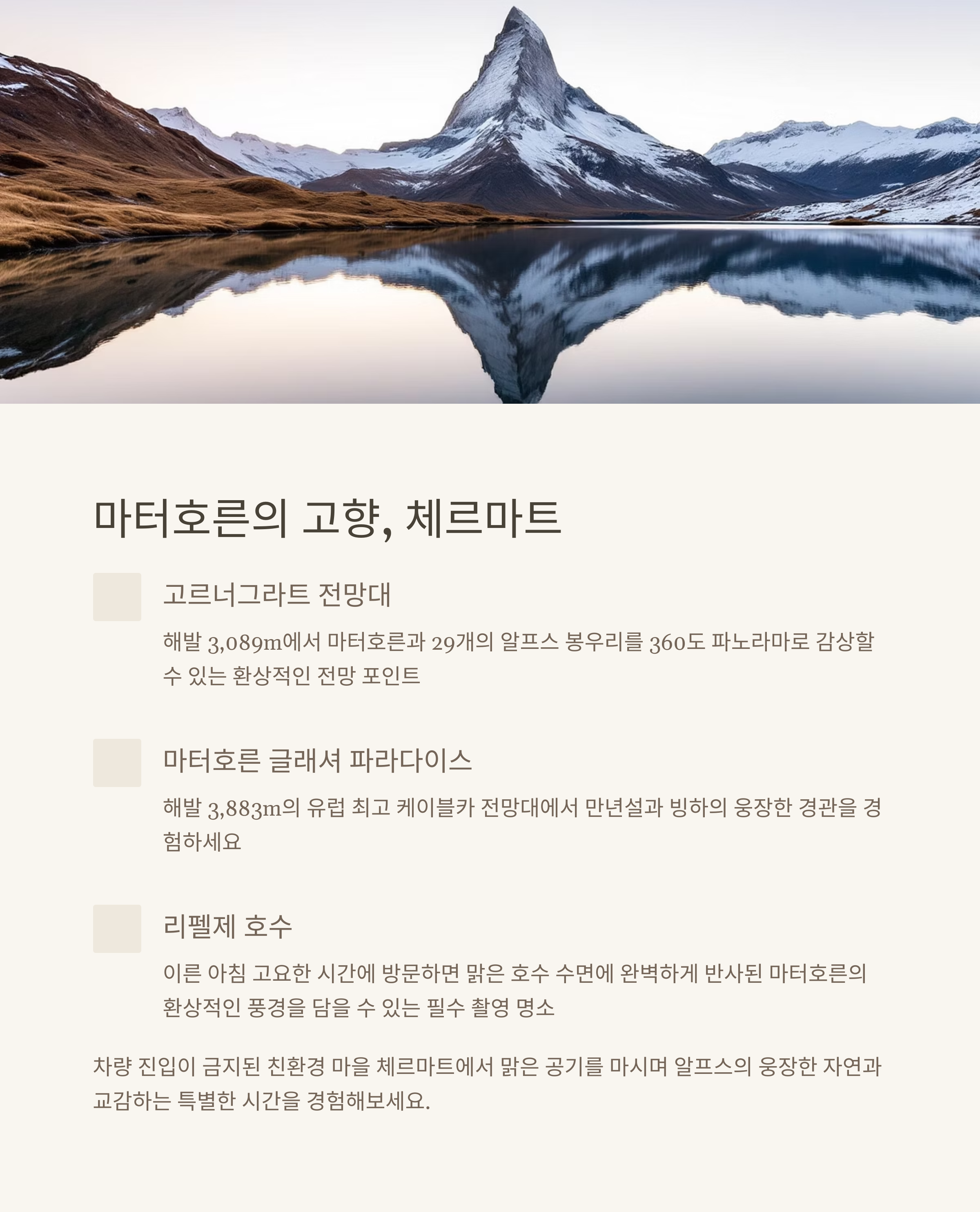 | 리펠제 호수 | 도보 가능 | 호수 반사 마터호른 포인트 |