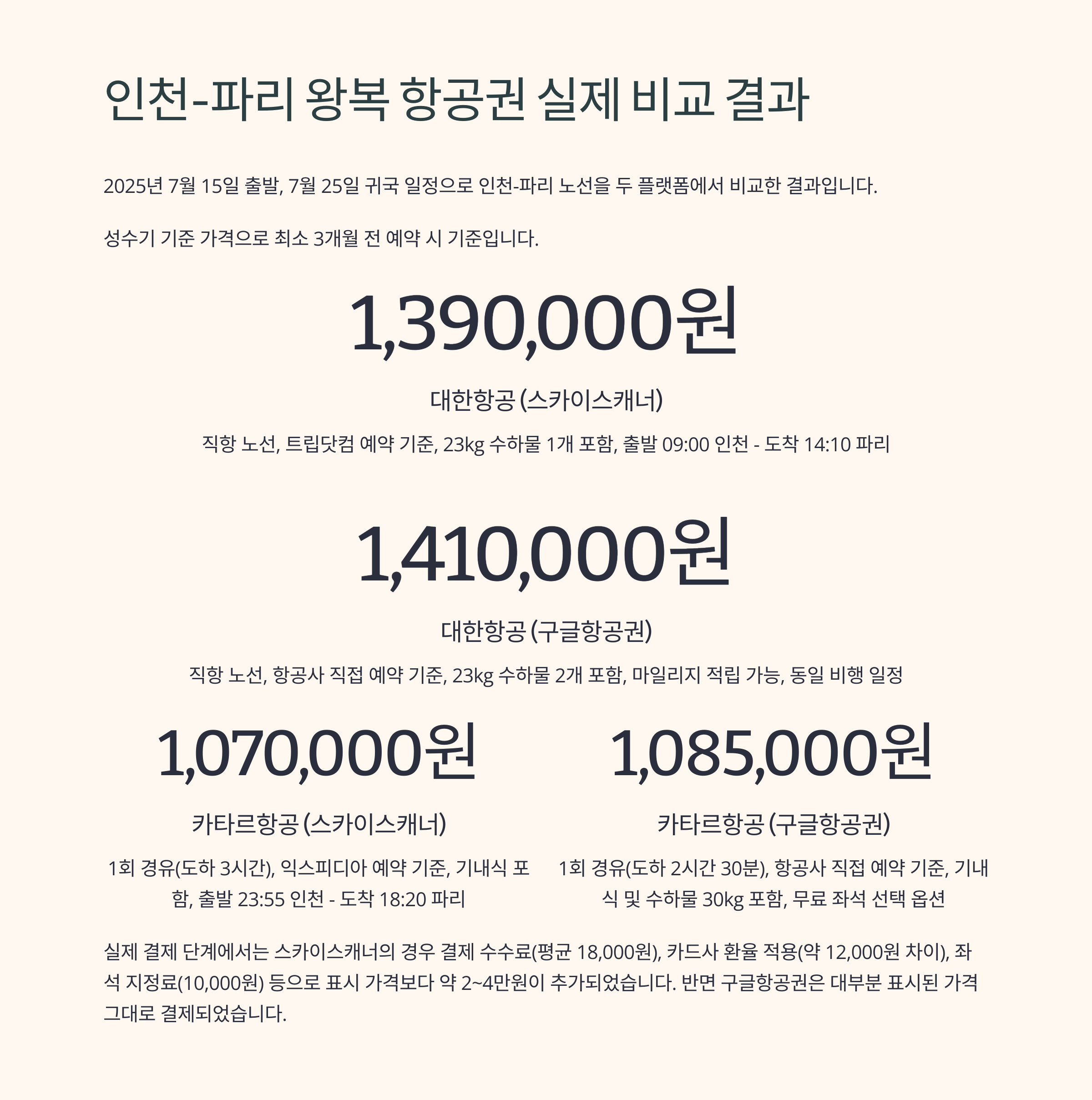인천 – 파리 왕복 항공권 실제 비교 결과 (2025년 7월 기준)