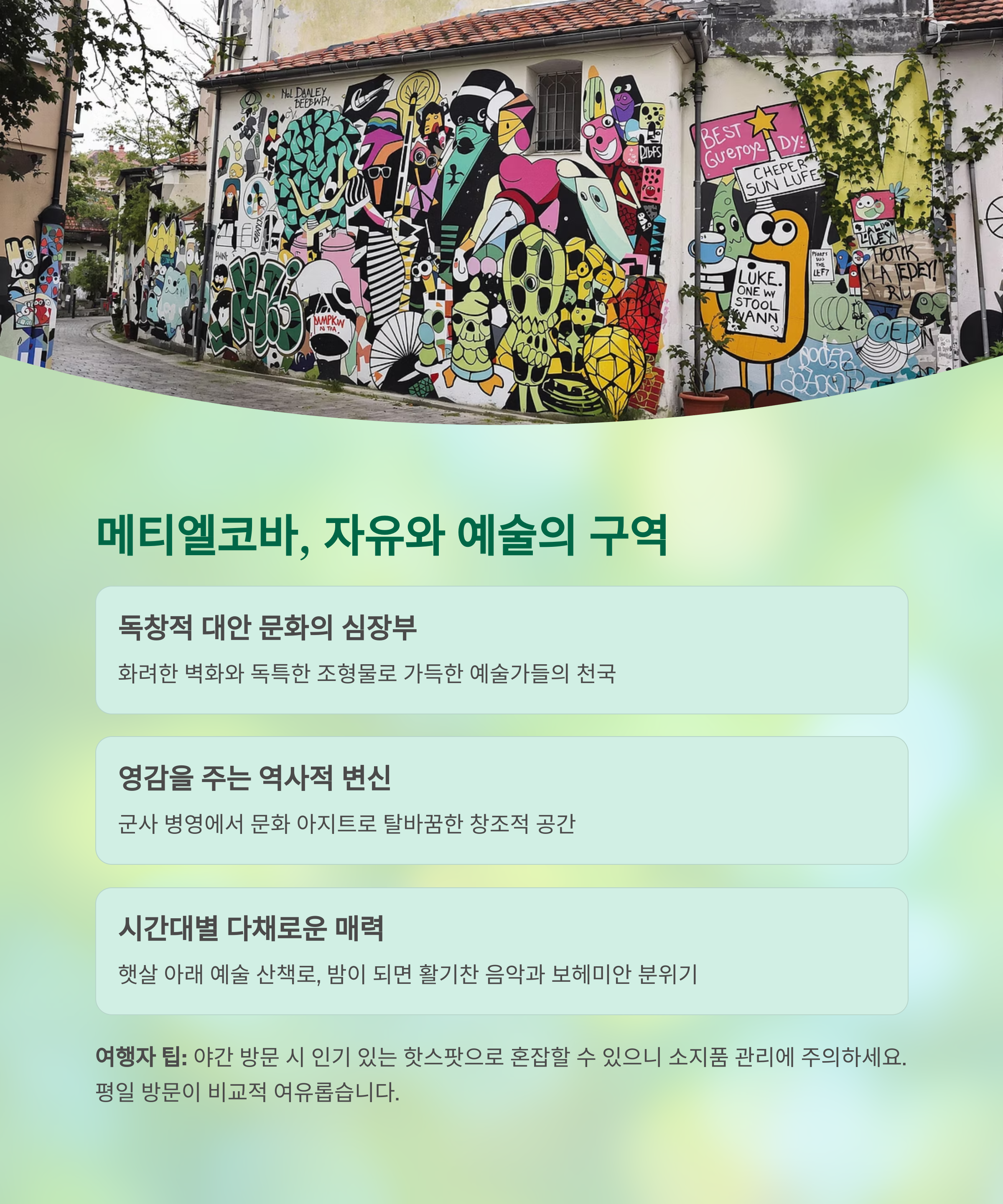 - 벽화와 조형물로 뒤덮인 대안 문화 공간