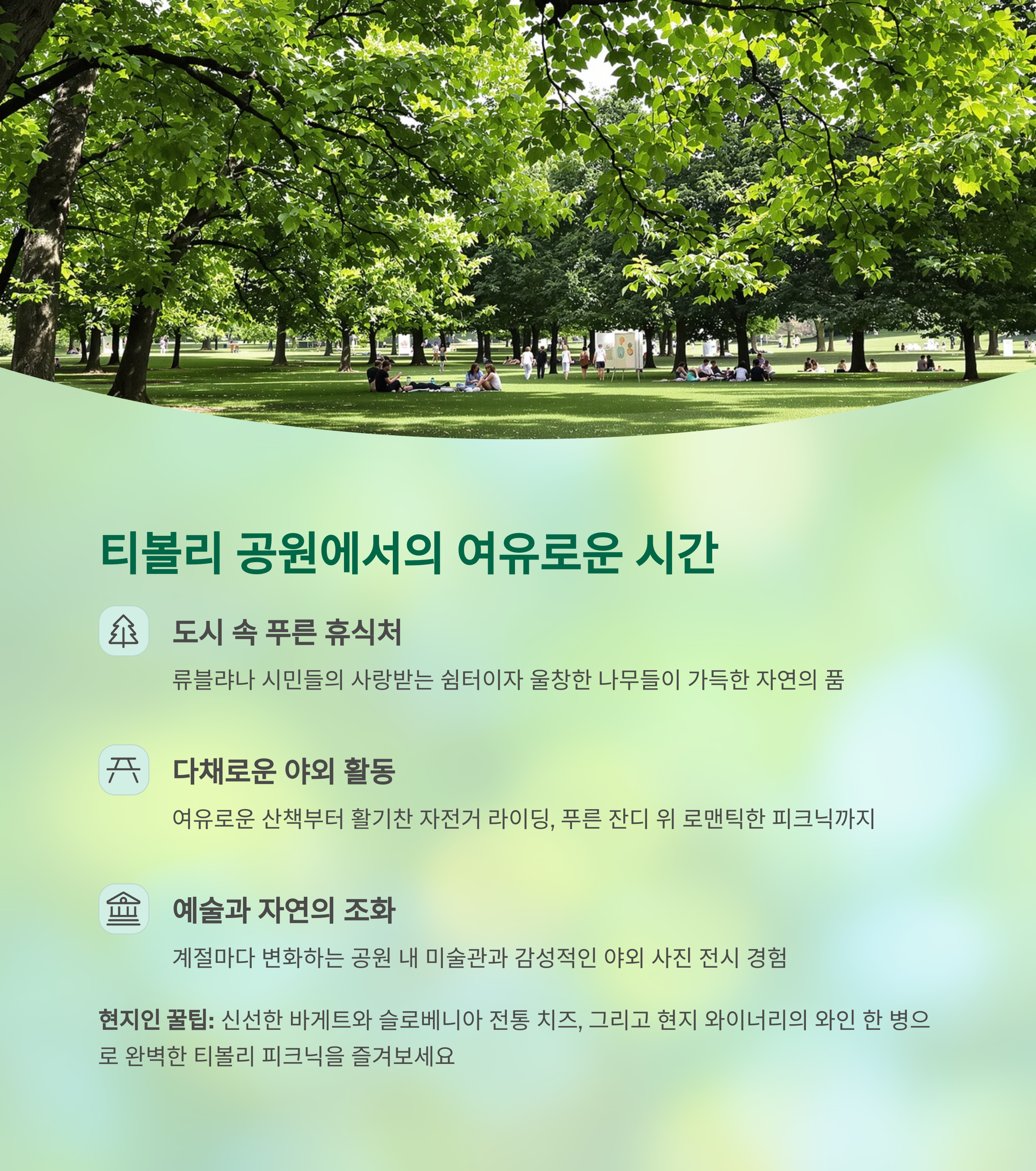 - 공원 안 미술관과 야외 사진 전시도 함께 즐길 수 있음
