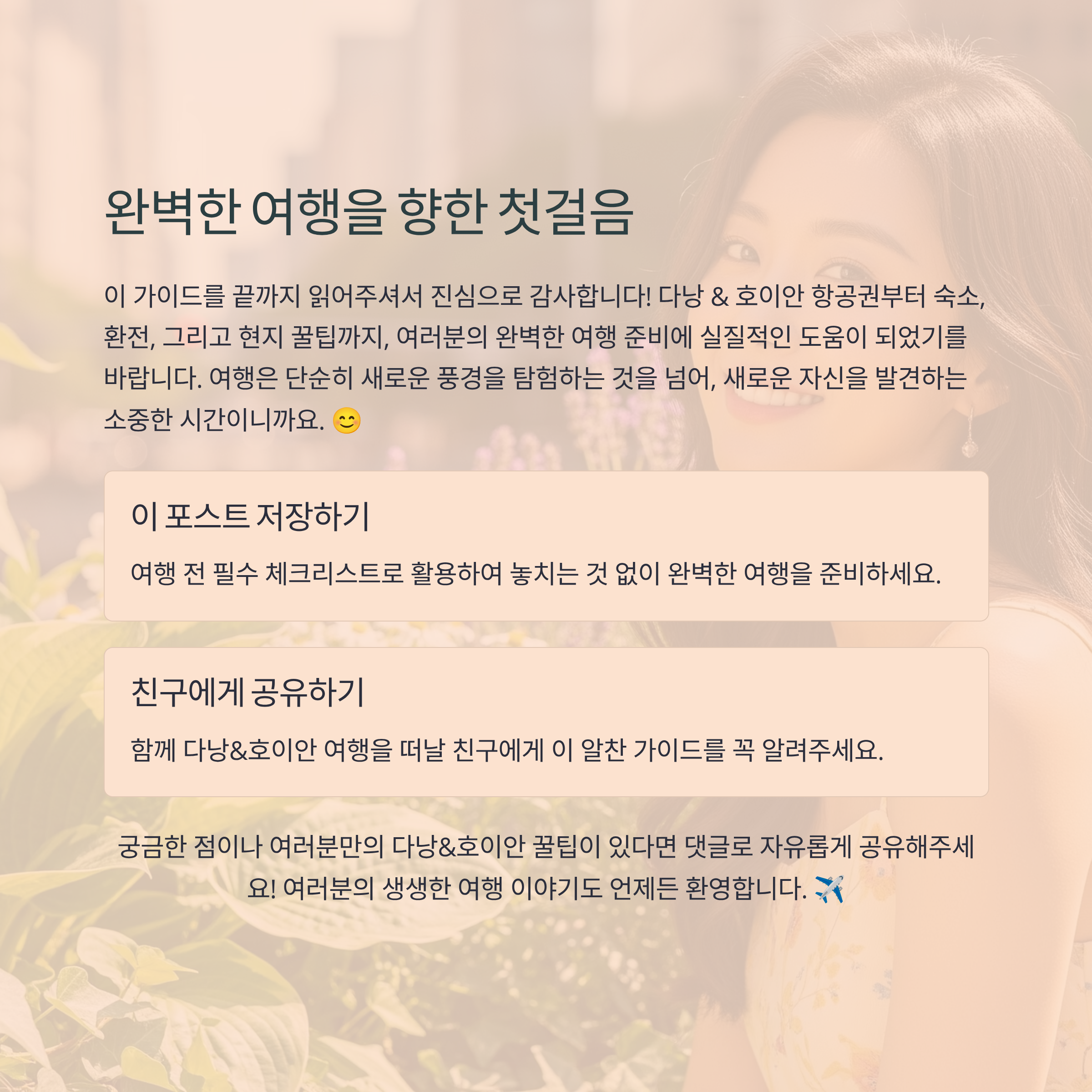 여기까지 긴 글 읽어주셔서 정말 감사해요! 제가 열심히 준비한 정보들이 여러분의 다낭 & 호이안 여행 계획에 실질적인 도움이 되었으면 좋겠어요. 😊