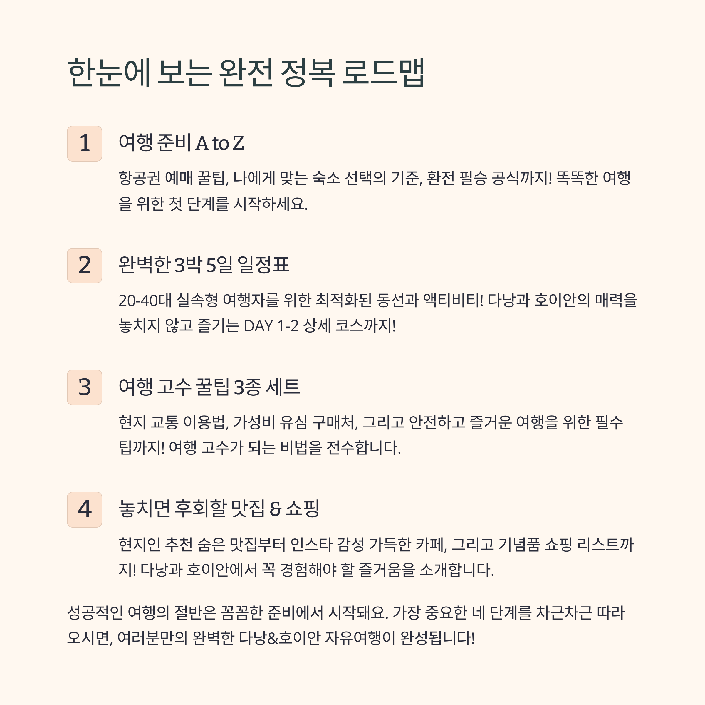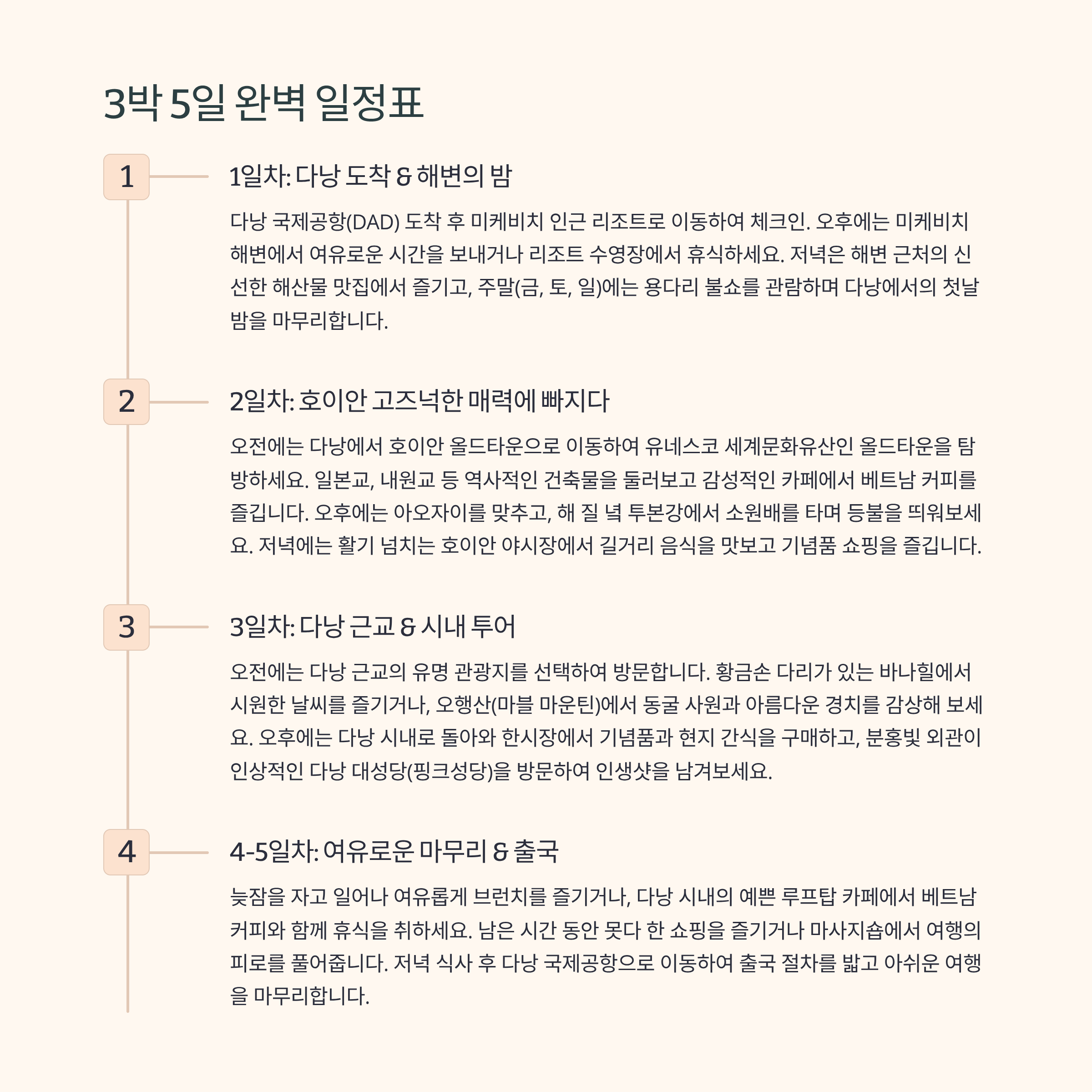 다낭과 호이안의 매력을 모두 느낄 수 있는 가장 효율적인 3박 5일 추천 일정이에요. 이대로만 따라오셔도 후회 없을 거예요!