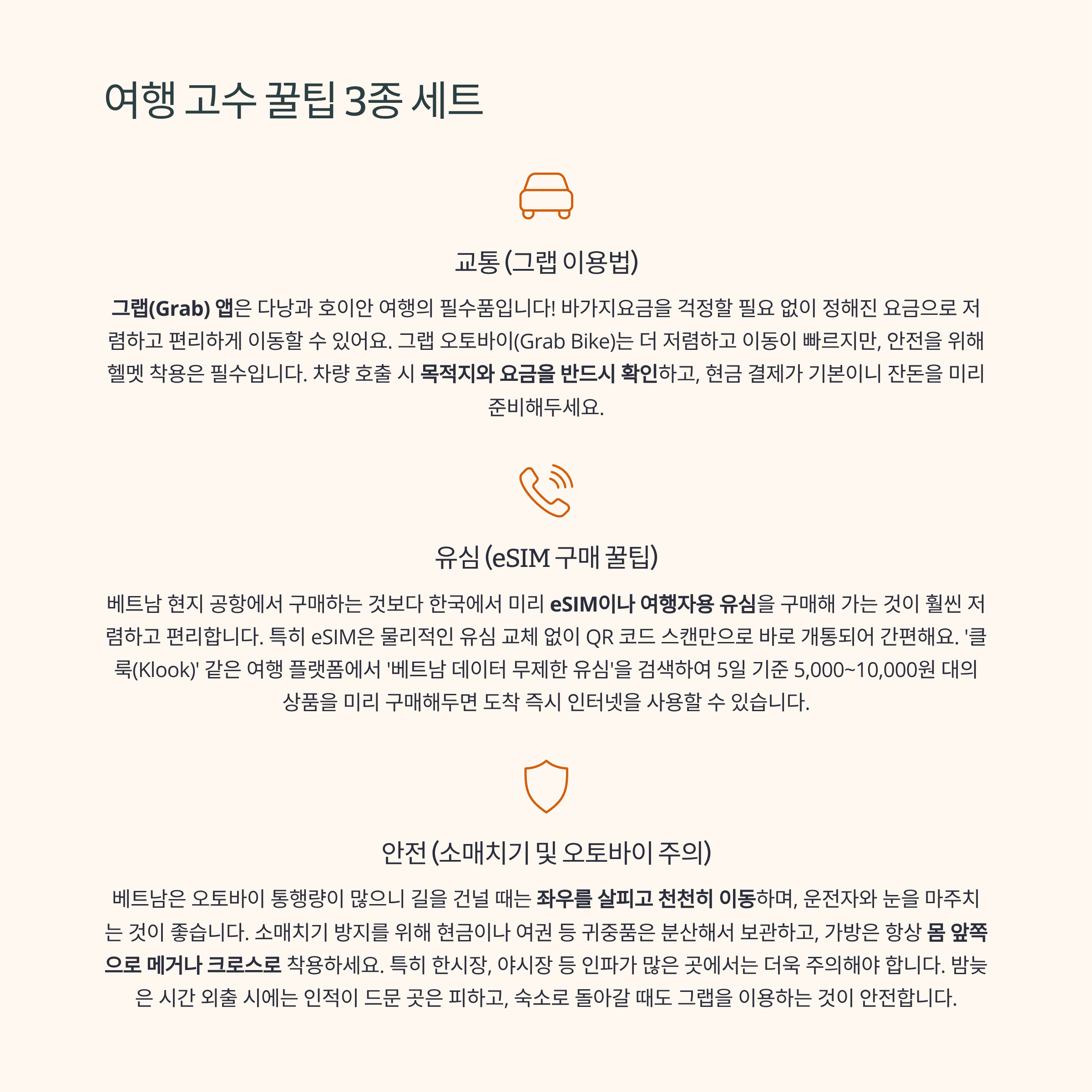 - 교통: 다낭과 호이안에서는 그랩(Grab) 앱이 필수예요! 바가지요금 없이 저렴하고 편리하게 이동할 수 있습니다.