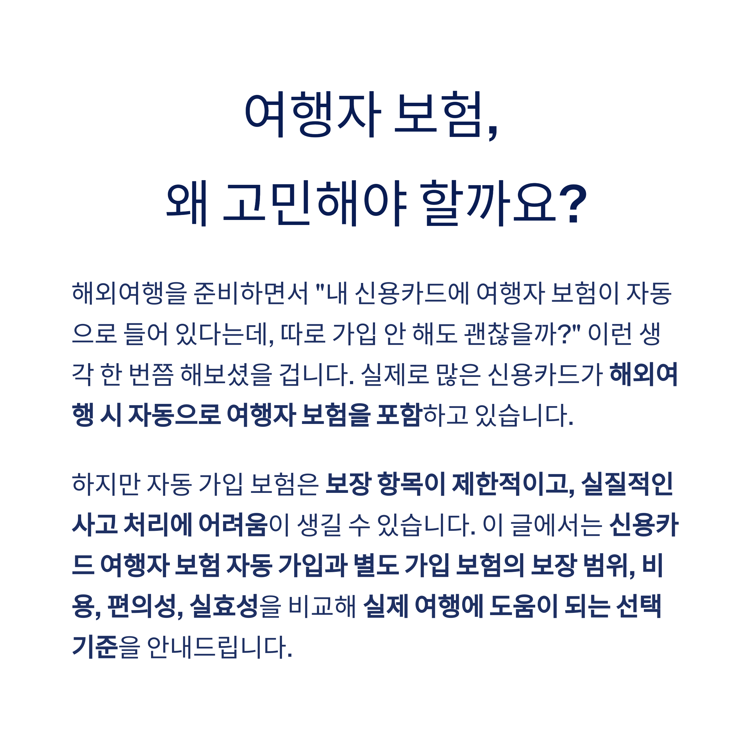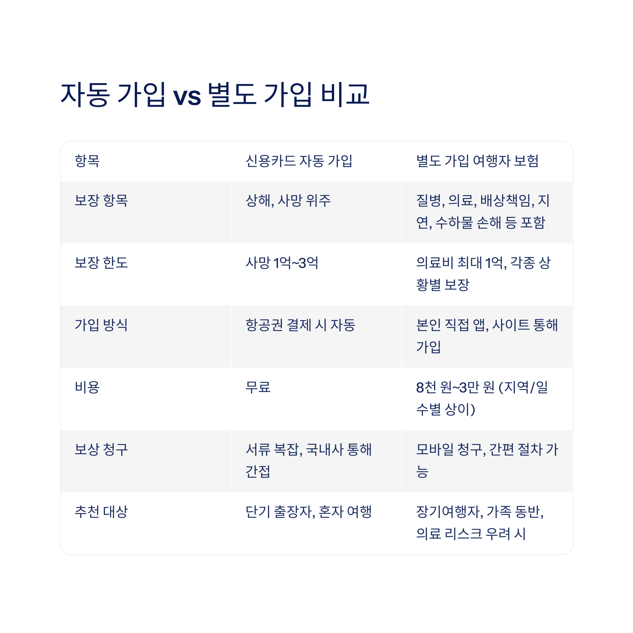 이 글에서는 신용카드 여행자 보험 자동 가입과 별도 가입 보험의 보장 범위, 비용, 편의성, 실효성을 비교해