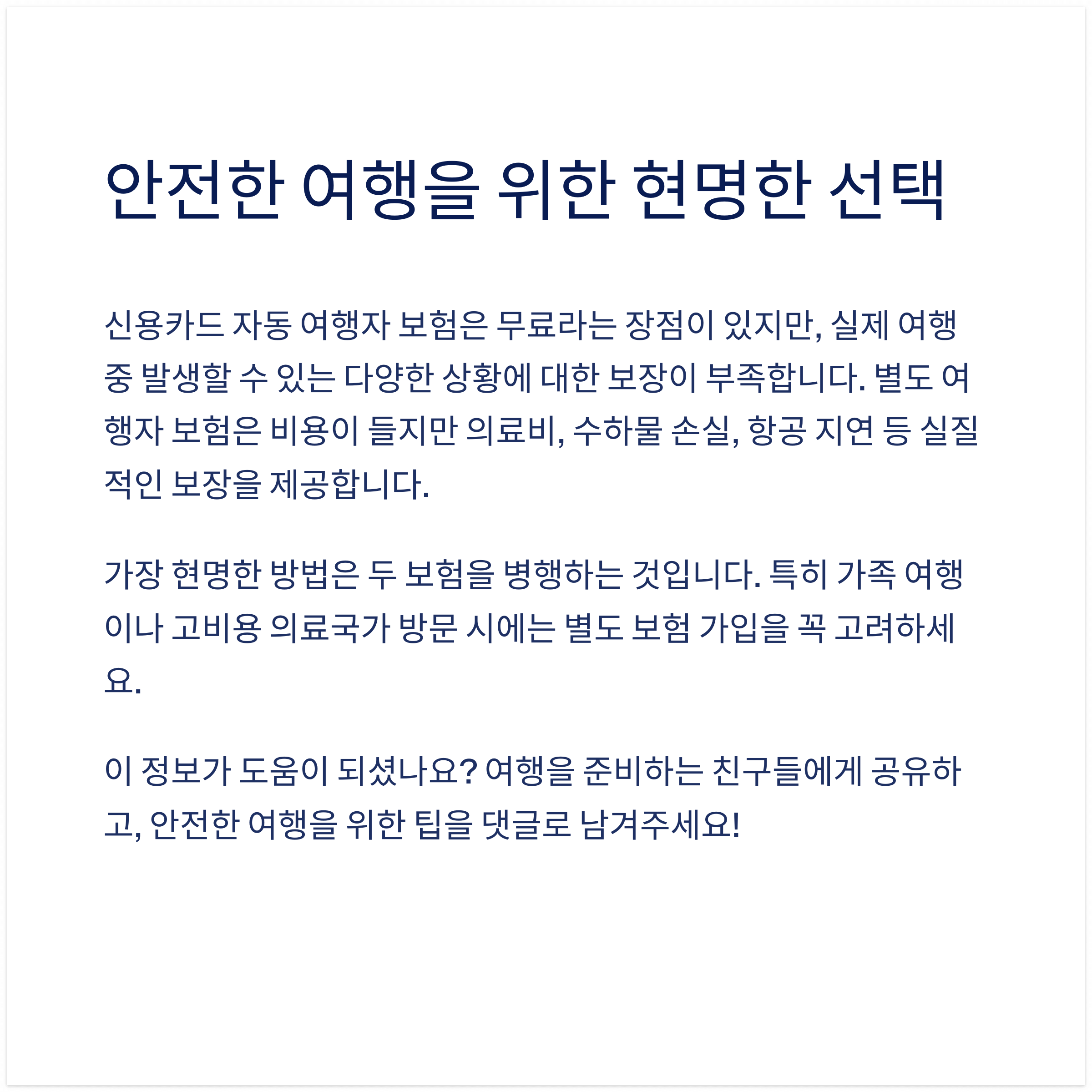 • 별도 보험은 실제 의료비, 수하물, 지연 상황 등 실질적 대비를 위해 꼭 필요