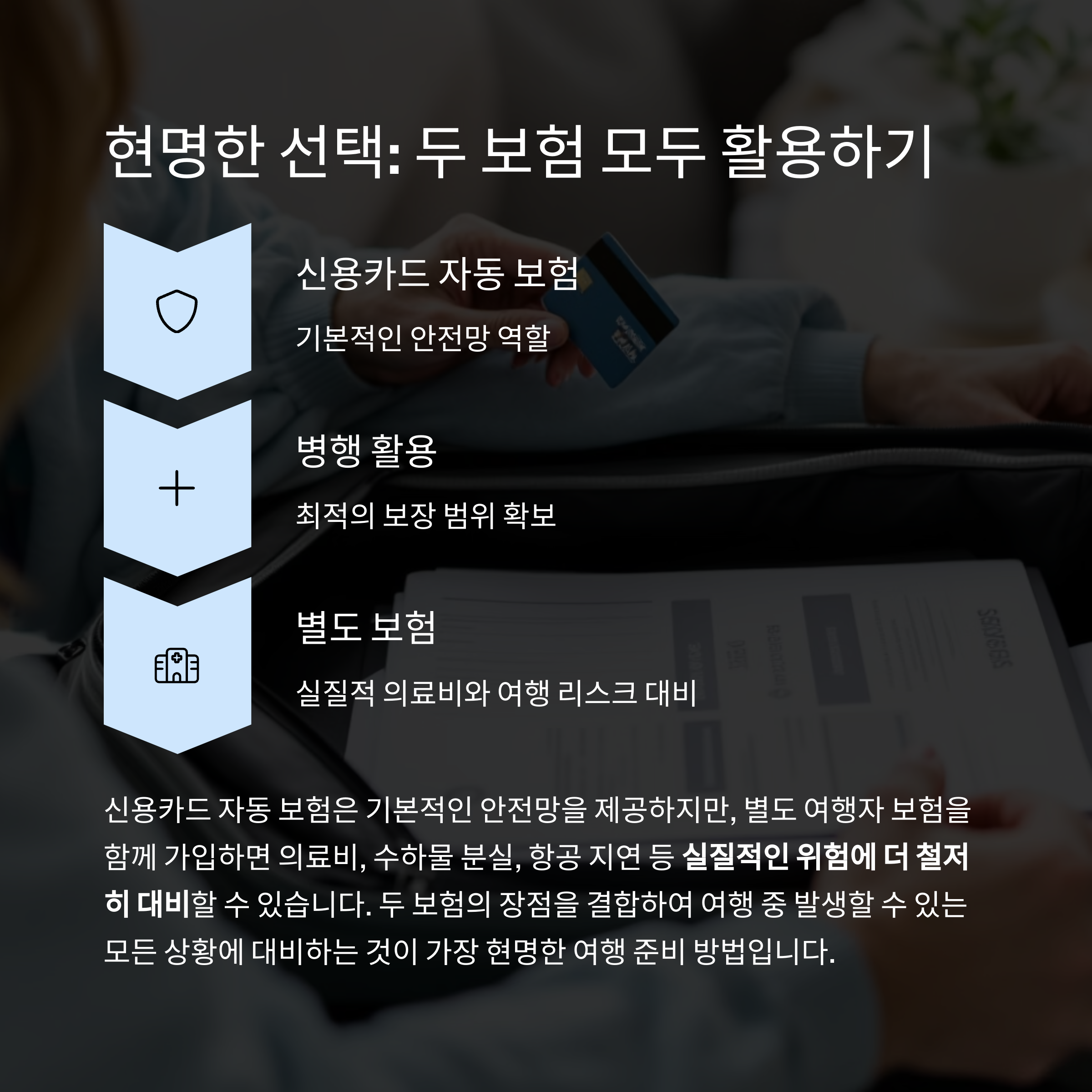 - 신용카드 자동 보험은 기본 보장 역할로 두되