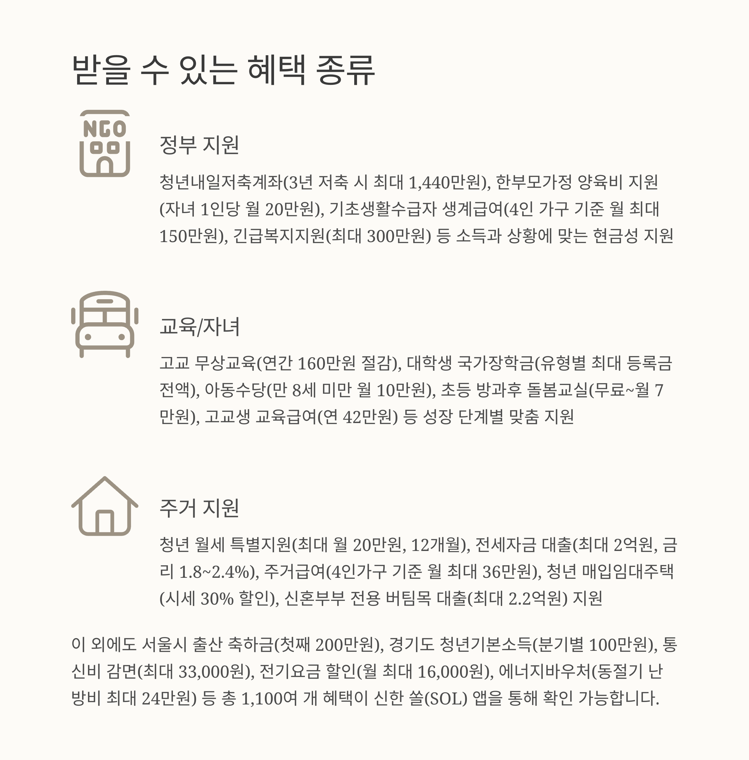 - 혜택 수: 1100개 이상 (국가·지자체·민간 연계 복지 포함)