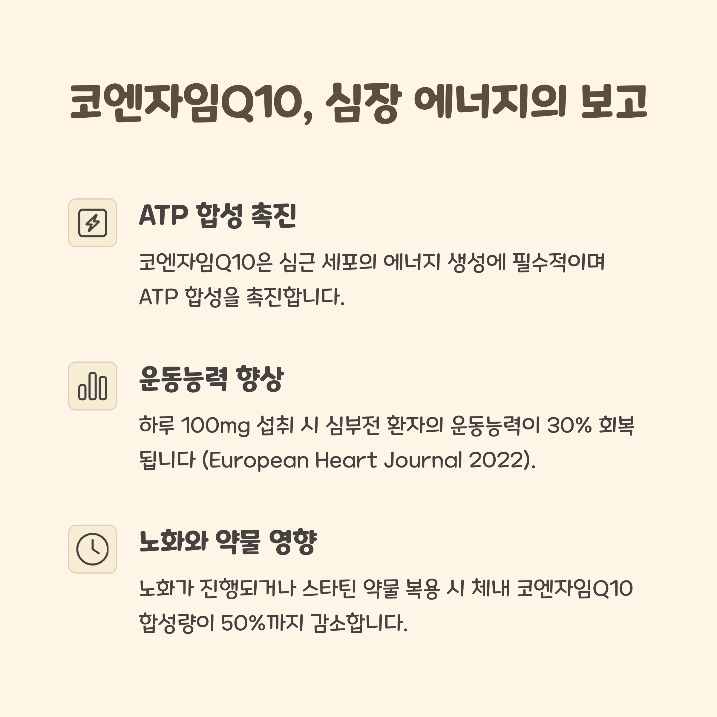 코엔자임Q10은 심장 세포가 에너지를 생산하는 데 꼭 필요한 항산화 영양소입니다.