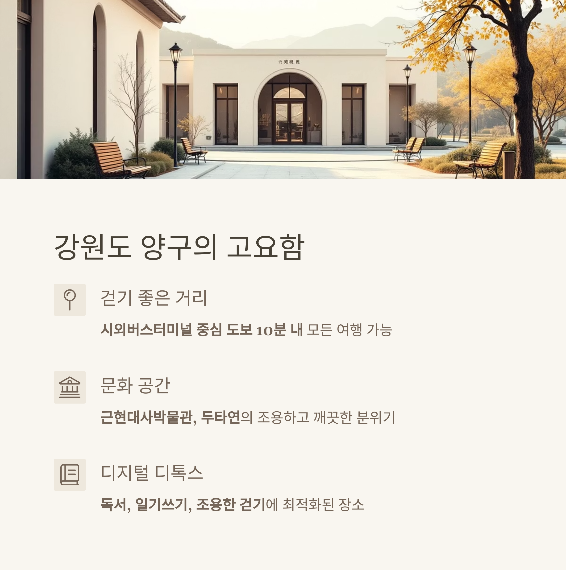 | 양구 | 정적·디톡스 | 독서·산책 | 도시 소음 제로 |
