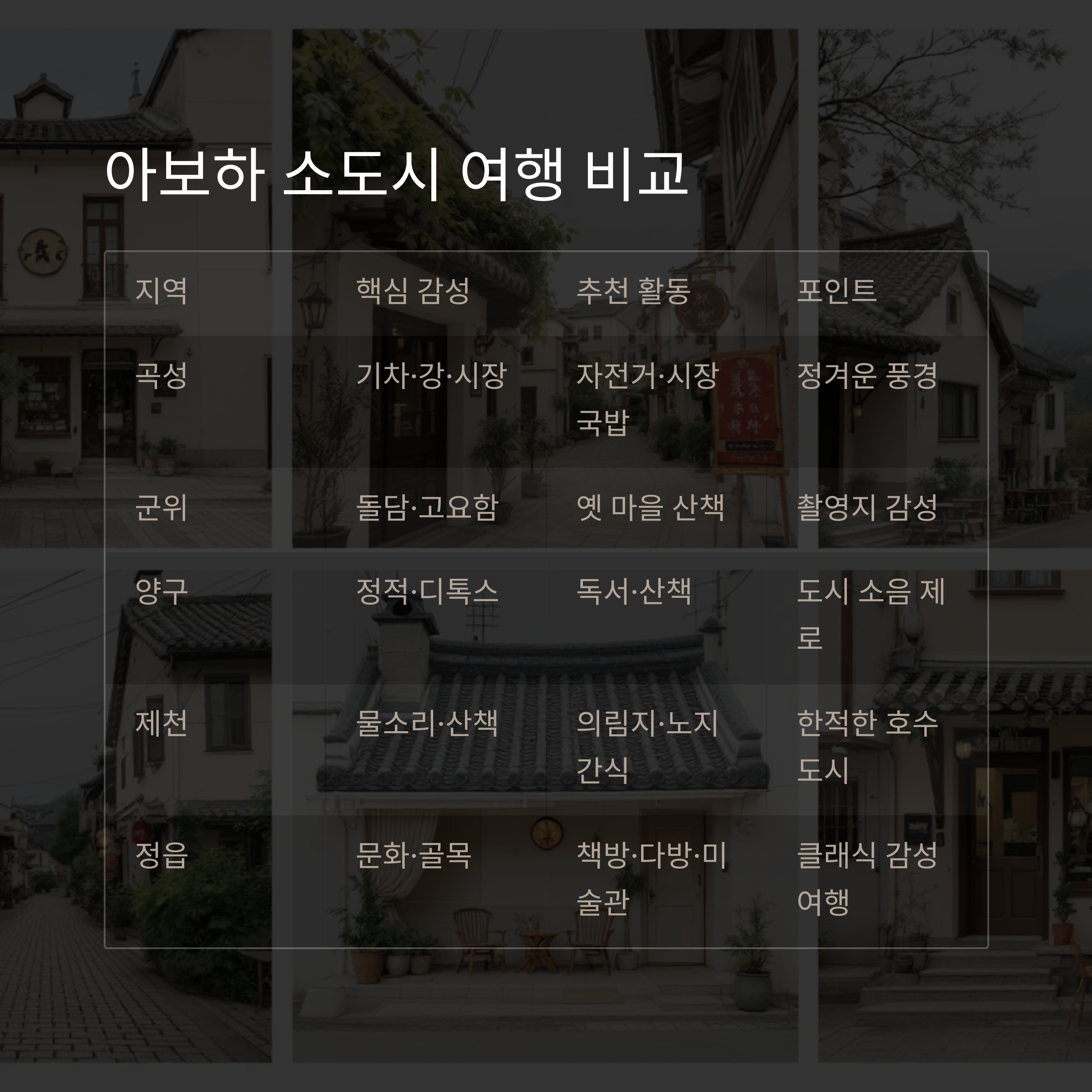 국내 소도시 5곳을 중심으로 아보하 스타일 코스를 구성했습니다.