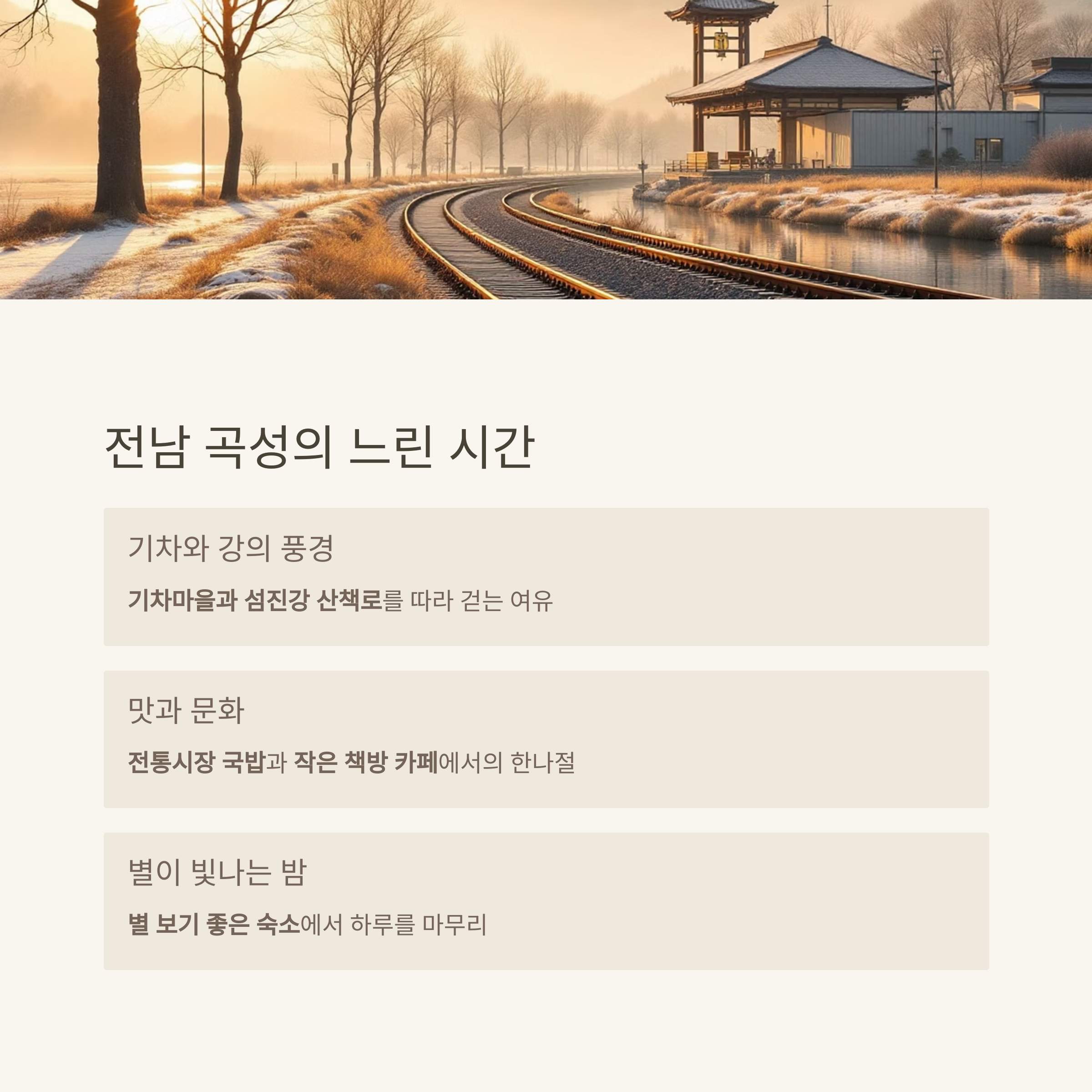 | 곡성 | 기차·강·시장 | 자전거·시장국밥 | 정겨운 풍경 |