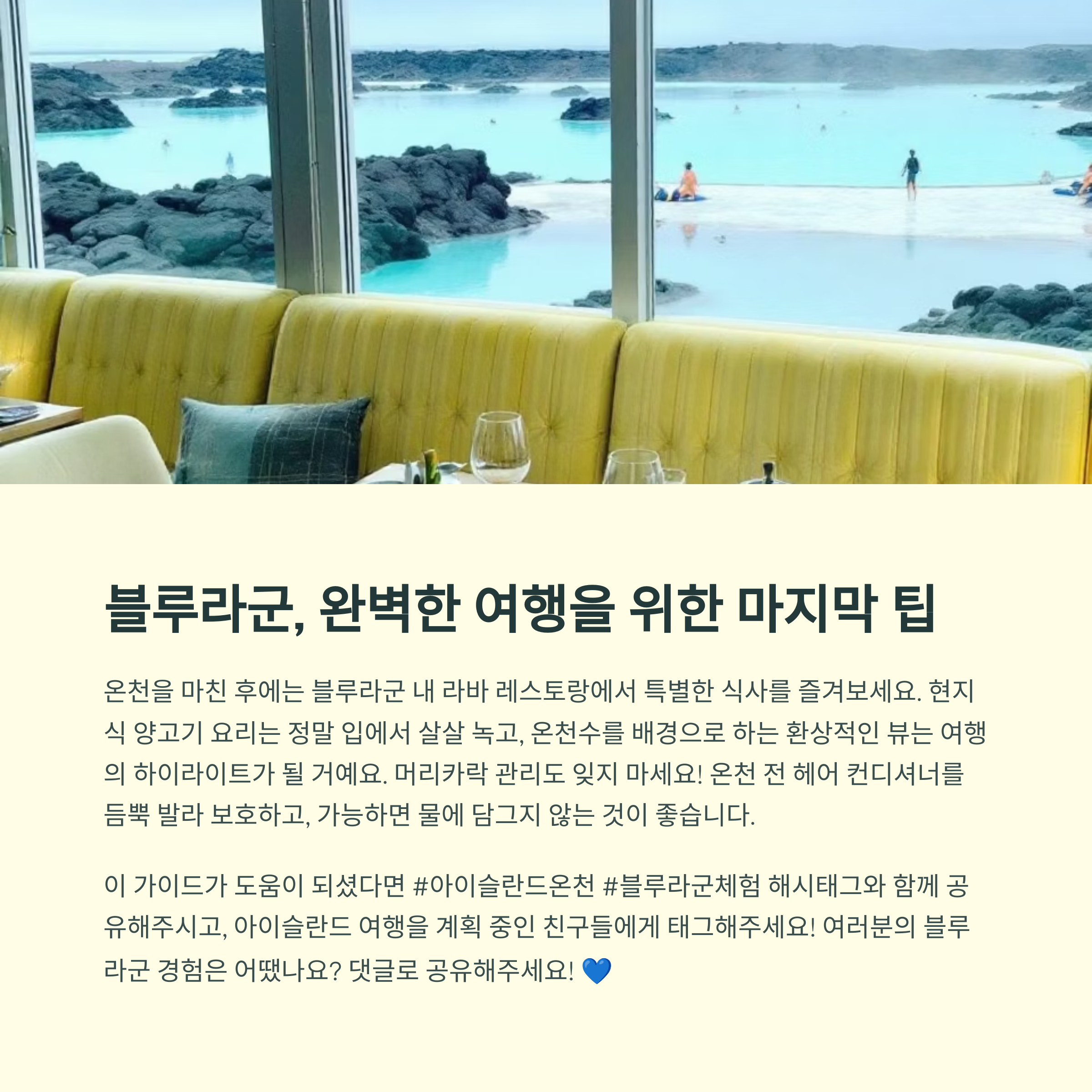 블루라군 온천수는 피부엔 좋지만 머리카락엔 조금 자극적일 수 있어요. 입장 전에 헤어 컨디셔너를 듬뿍 바르고 들어가야 나중에 머리가 뻣뻣해지지 않아요. 긴 머리는 묶고, 되도록 물에 담그지 않는 게 좋아요.