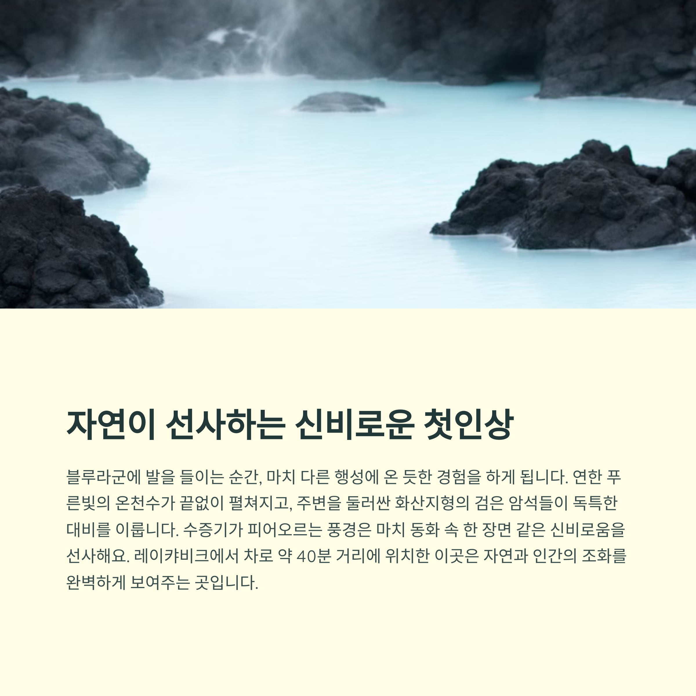 아이슬란드를 여행하면서 절대 빼놓을 수 없는 명소가 바로 블루라군 온천이에요. 수도 레이캬비크에서 차로 약 40분 정도 떨어진 이곳은, 유럽 감성과 자연이 절묘하게 어우러진 힐링 스팟이죠. 이번 글에서는 제가 직접 다녀온 블루라군 온천 체험을 바탕으로 분위기, 이용 팁, 준비물까지 꼼꼼하게 소개해볼게요.