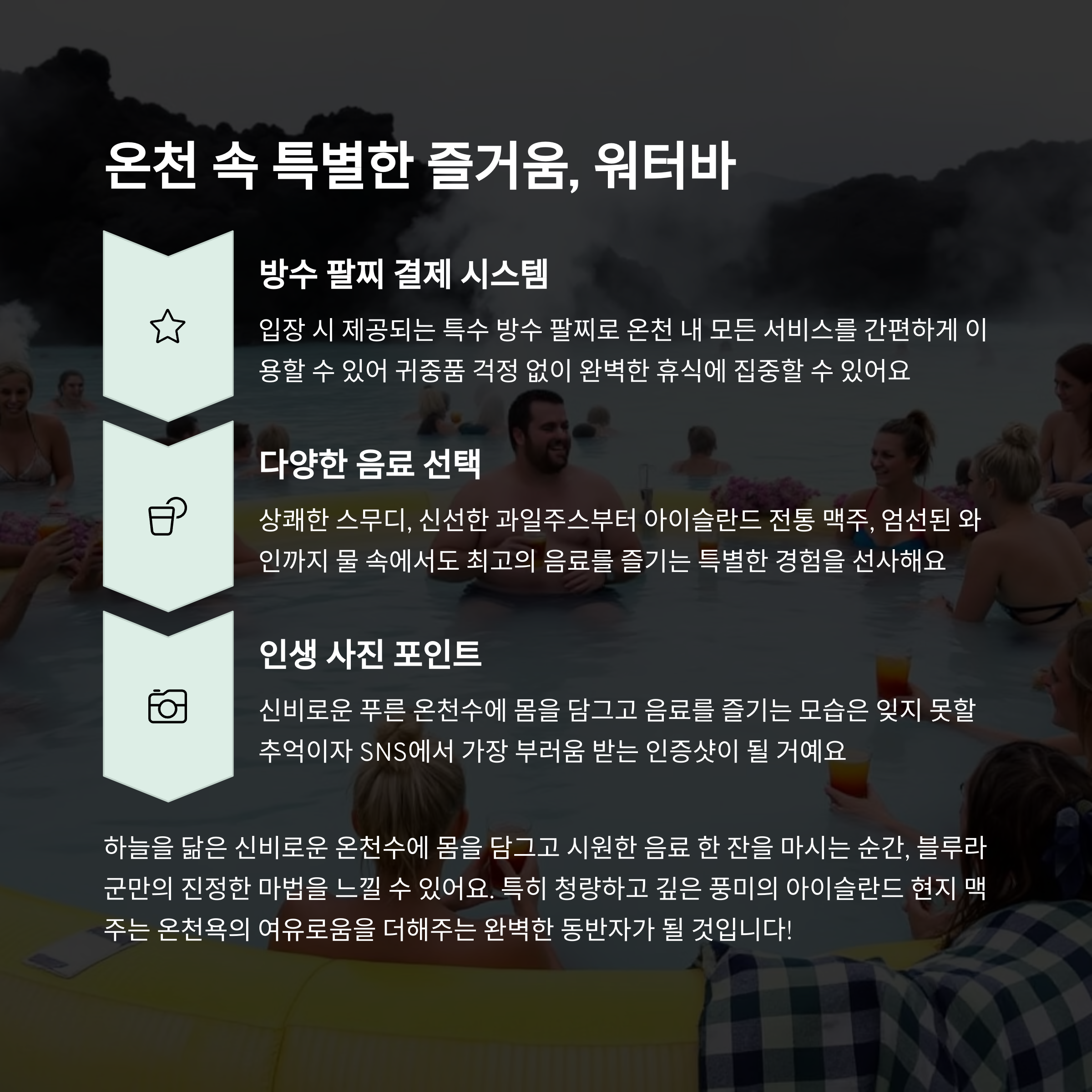온천 안에는 워터바가 있어서 맥주, 스무디 같은 음료를 마시면서 온천욕을 즐길 수 있어요. 방수 팔찌로 결제되니 현금을 따로 챙기지 않아도 되고, 따뜻한 물에 몸을 담근 채 음료 한 잔 들고 있는 순간이 정말 잊을 수 없었어요.