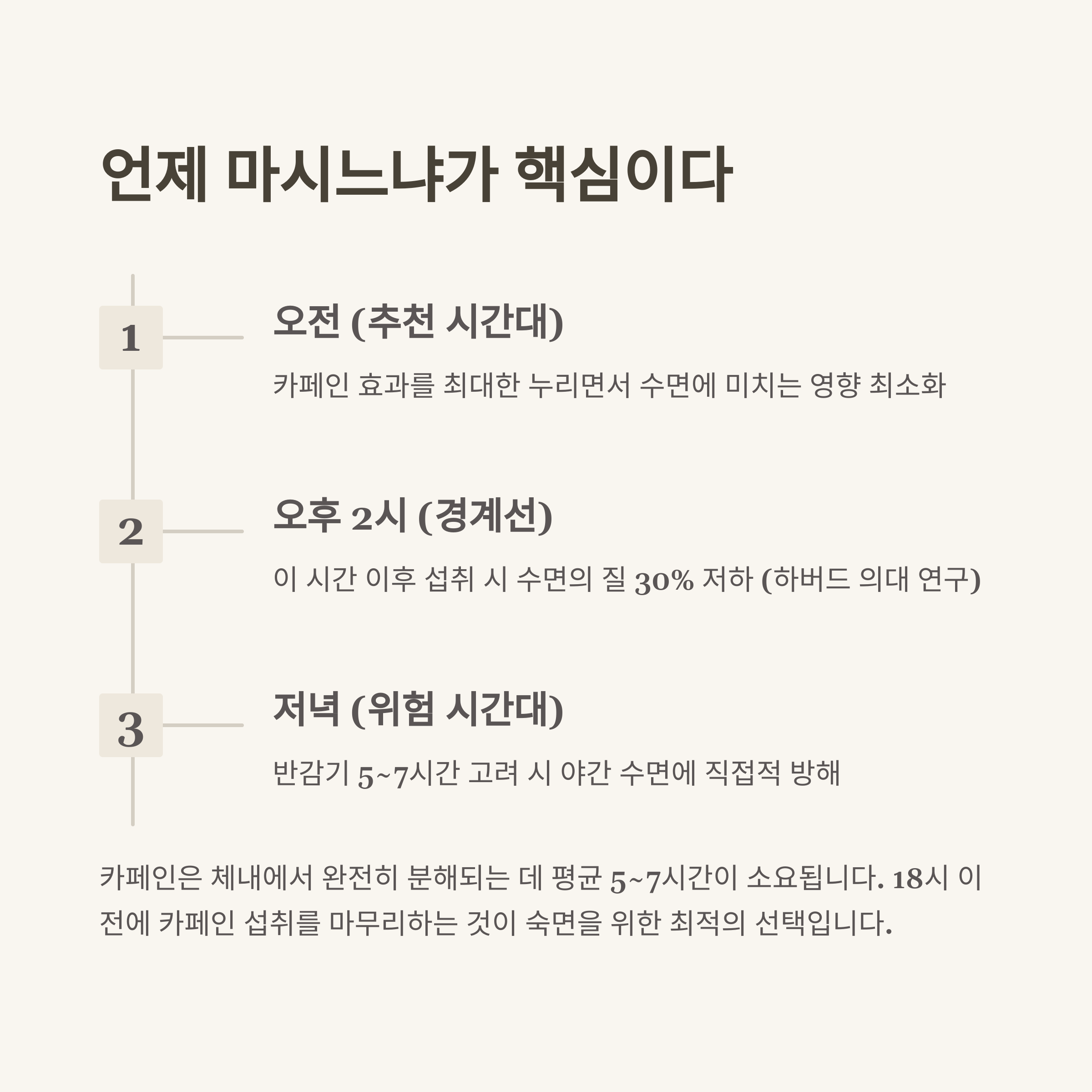 "오후 2시 이후에 섭취하는 카페인은 야간 수면 패턴에 직접적인 악영향을 줍니다."