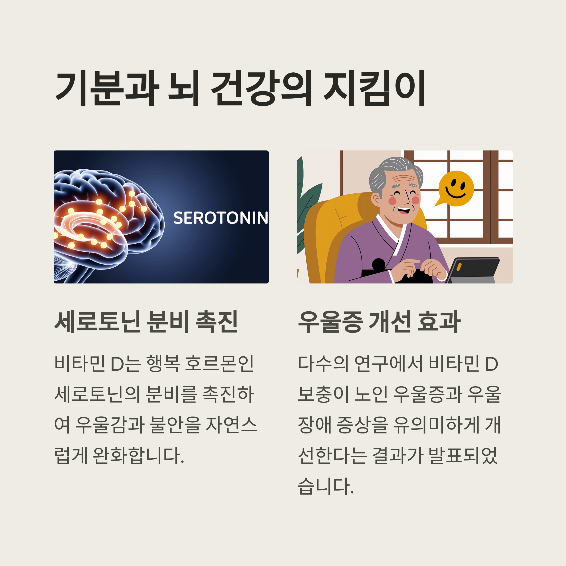 | 비타민 D란? | 햇빛을 통해 체내 합성되며, 칼슘 흡수, 면역 기능, 기분 조절에 관여하는 지용성 비타민 |