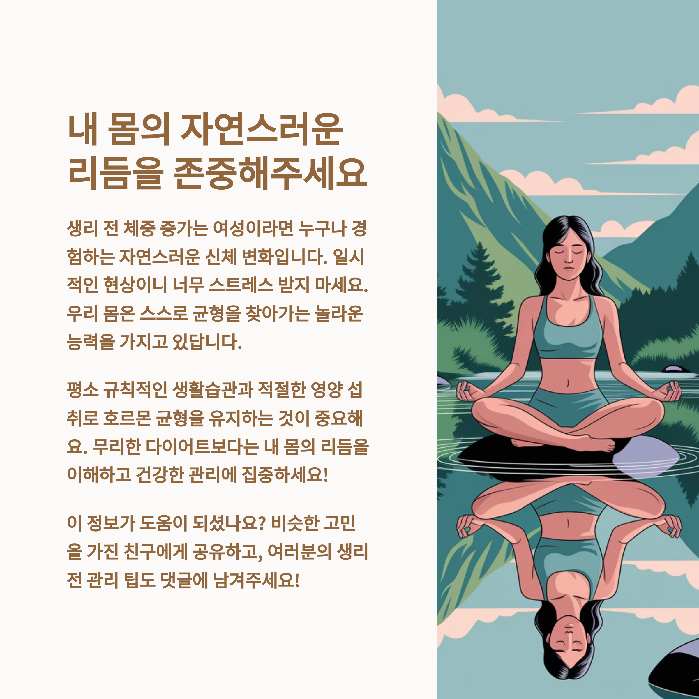 체중 증가, 붓기, 피로감을 어떻게 관리하고 계신가요? 생리 주기에 맞춘 나만의 루틴이나 팁이 있다면 댓글로 함께 나눠주세요!