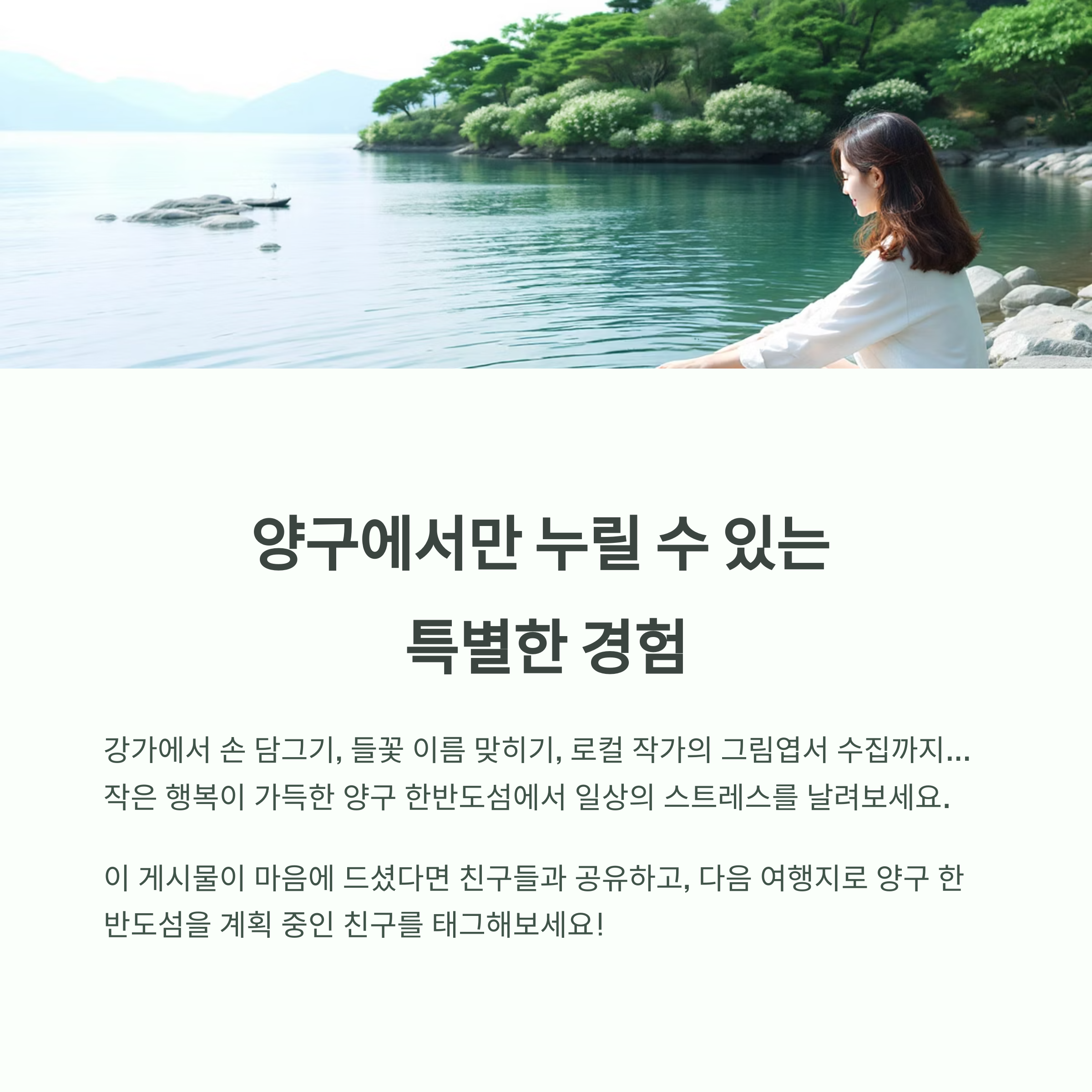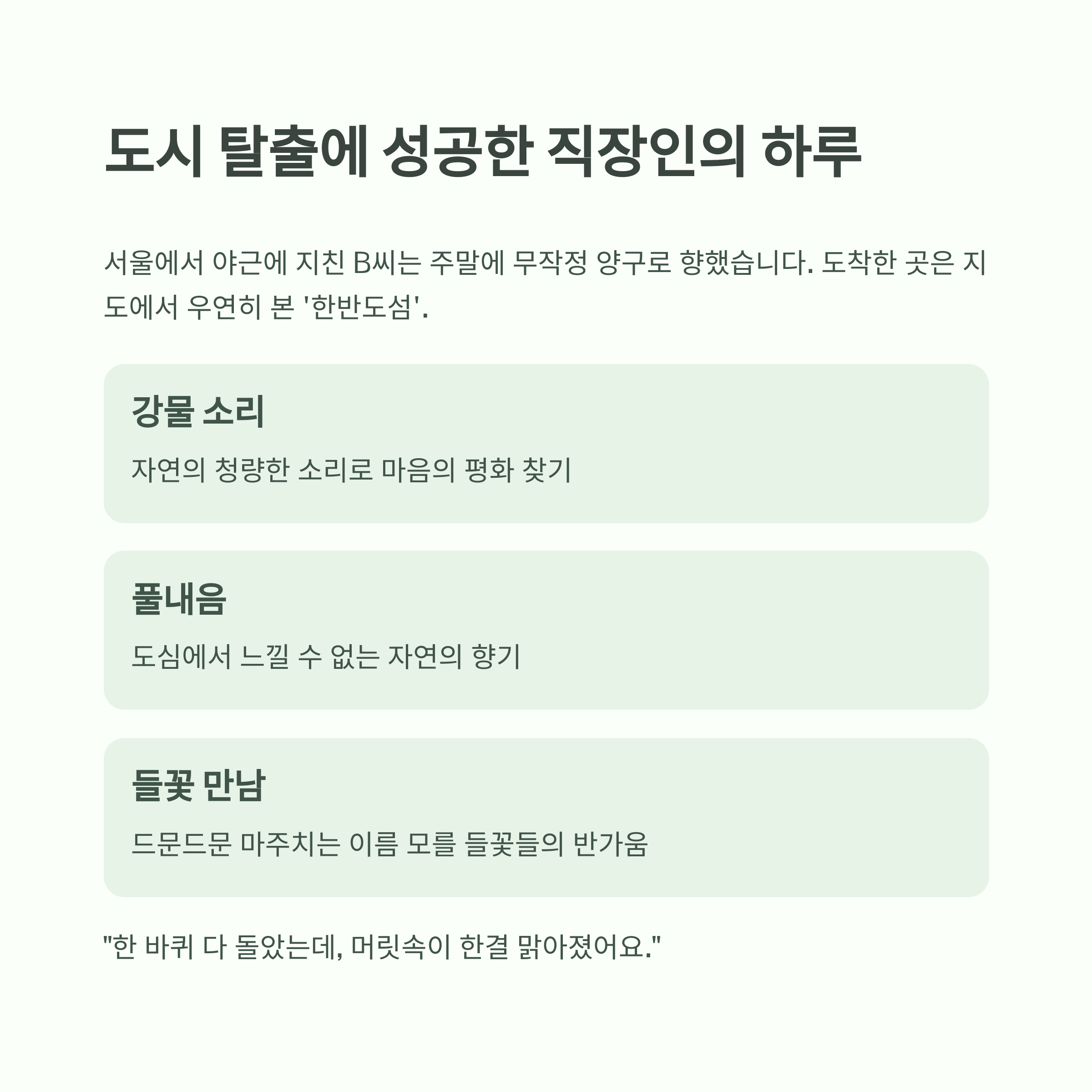 “자연에 둘러싸여 조용히 걷고, 쉬고, 맛보고 오는 완벽한 소확행 여행입니다.”